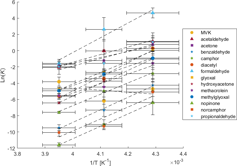 MVK however shows a weak negative trend with inverse temperature with a nonsignificant correlation. The absence of this correlation for MVK complicates this view of K controlled by transport. However, this could be explained by kinetic control resulting from transport phenomena occurring in either the gas or solid phases, i.e. processes that change the rates of transport of MVK relative to water vapor rather than a K that is controlled by an equilibrium established between MVK and ice. However, without sufficient evidence for a mechanism of kinetically controlled transport, the measurements of K here will be interpreted using equilibrium thermodynamics. While outside the scope the current study, a kinetic explanation could be explored through theoretical calculations such as those found in Conklin and Bales (1993) or Reif (1965).