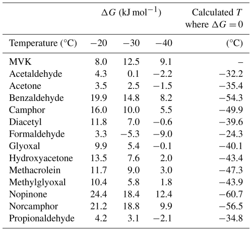 The other species – MVK, benzaldehyde, camphor, hydroxyacetone, methacrolein, methlyglyocal, nopinone, and norcamphor – were unfavorable to deposit into the ice phase under any of the conditions studied here. Extrapolating based on the linear regression in Table 3, the estimated temperature below which it is favorable to deposit the species (excepting MVK) is presented in Table 2. For these species, they would presumably become favorable to deposit into the ice phase within the range of −43 to −61 °C, which is within the natural range for cirrus clouds. With MVK having both a poor regression (r2= 0.1235) and nonexothermic behavior, the temperature at which ΔG= 0 cannot be meaningfully extrapolated.