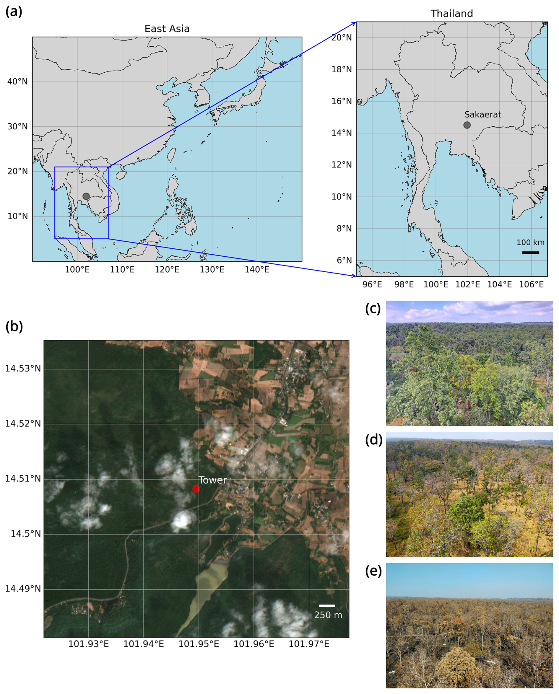 Figure 1(a) Location and (b) surrounding environment of the observation site (gray circle) and tower (red circle) in the Sakaerat Environmental Research Station. Satellite imagery (6 km × 6 km) was retrieved from the dataset of Sentinel-2 Surface Reflectance Harmonized (COPERNICUS/S2_SR_HARMONIZED) via © Google Earth Engine. The data was filtered for the observation point, and date from 15 to 31 December 2023, with a cloud cover percentage of less than 20 % was shown. (c–e) Photos of canopy condition at the begging of the leafy period (c) and the leafless period (d), and the end of the campaign (e). All the photos were taken from the same direction facing north.