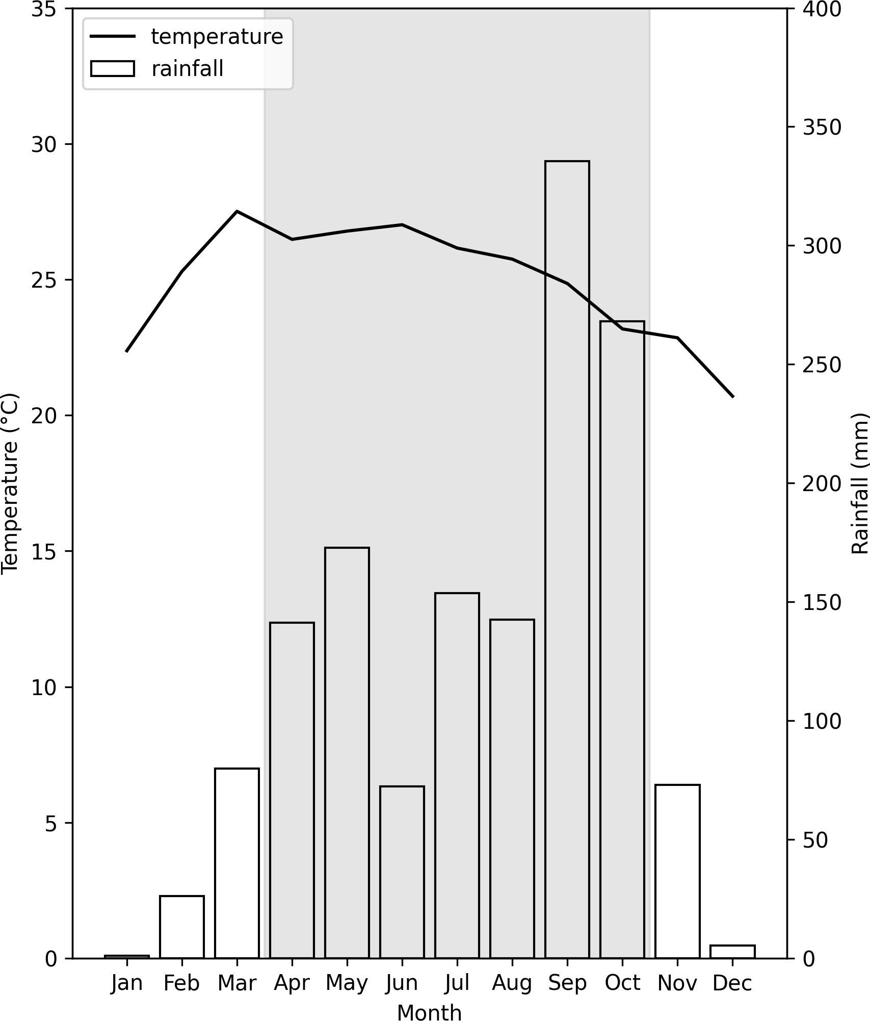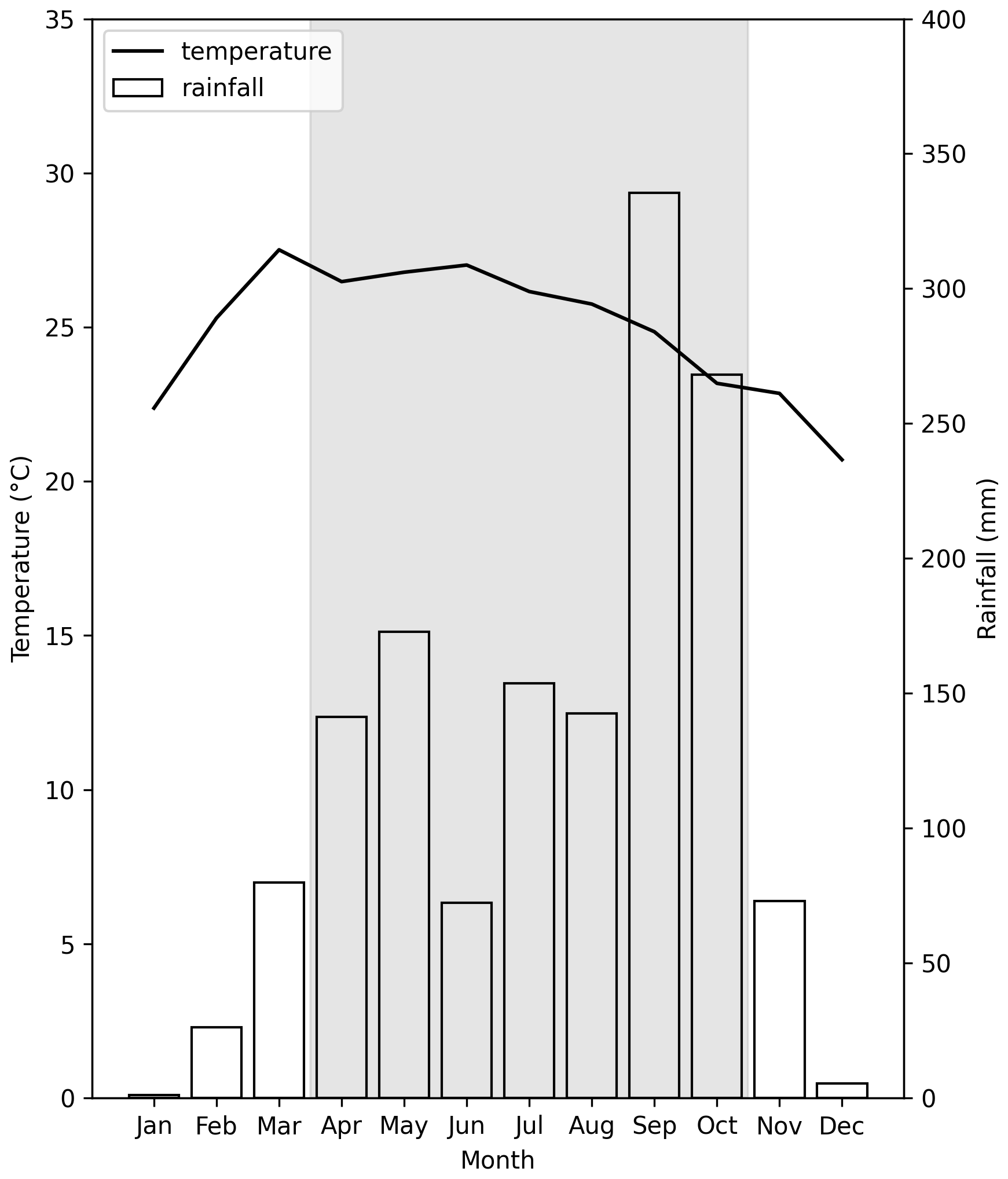 We conducted the observation in the forest of Sakaerat Environmental Research Station (SERS), Nakhon Ratchasima Province, Thailand (14°30′ N, 101°55′ E), as shown in Fig. 1. SERS is the core area of the Sakaerat Biosphere Reserve, which was the first biosphere reserve in Thailand recognized for its rich biodiversity of flora and fauna. According to the Köppen climate classification, SERS is classified as a tropical savanna, with annual mean air temperature of 24.9 °C and annual rainfall of 1472 mm during the 3 years from 2020 to 2022 (Fig. 2). SERS is characterized by high temperatures throughout the year and distinct wet (April to October) and dry (November to March) seasons (Matsuda et al., 2012). From December to February, the dry season is especially pronounced, with a monthly rainfall of less than 50 mm (Sase et al., 2017, 2012). The forest of SERS consists of dry evergreen and dry deciduous forests (DDF) (Murata et al., 2009). We used a 38 m walk-up observation tower installed in the DDF located near the northeastern edge of the SERS. The DDF is almost flat and sparse, and Dipterocarps such as Shorea obtusa and Shorea siamensis dominate in the area around the tower (Murata et al., 2011), with a canopy height (h) of about 20 m. Leaf area index (LAI) was measured at 4 locations within approximately 50 m of the observation tower by a plant canopy analyzer (LI-COR, LAI-2200) at the beginning of the observation period (15 December 2023). The measured LAI was in the range from 2.5 to 4.2 with a mean and standard deviation of 3.1 ± 0.7. Although the eastern side of SERS is mainly covered by agricultural fields and residential areas, the observation tower is located at least 400 m away from these areas. Further details regarding the topography and seasonal variations in leaf conditions of the DDF are described in Matsuda et al. (2012).