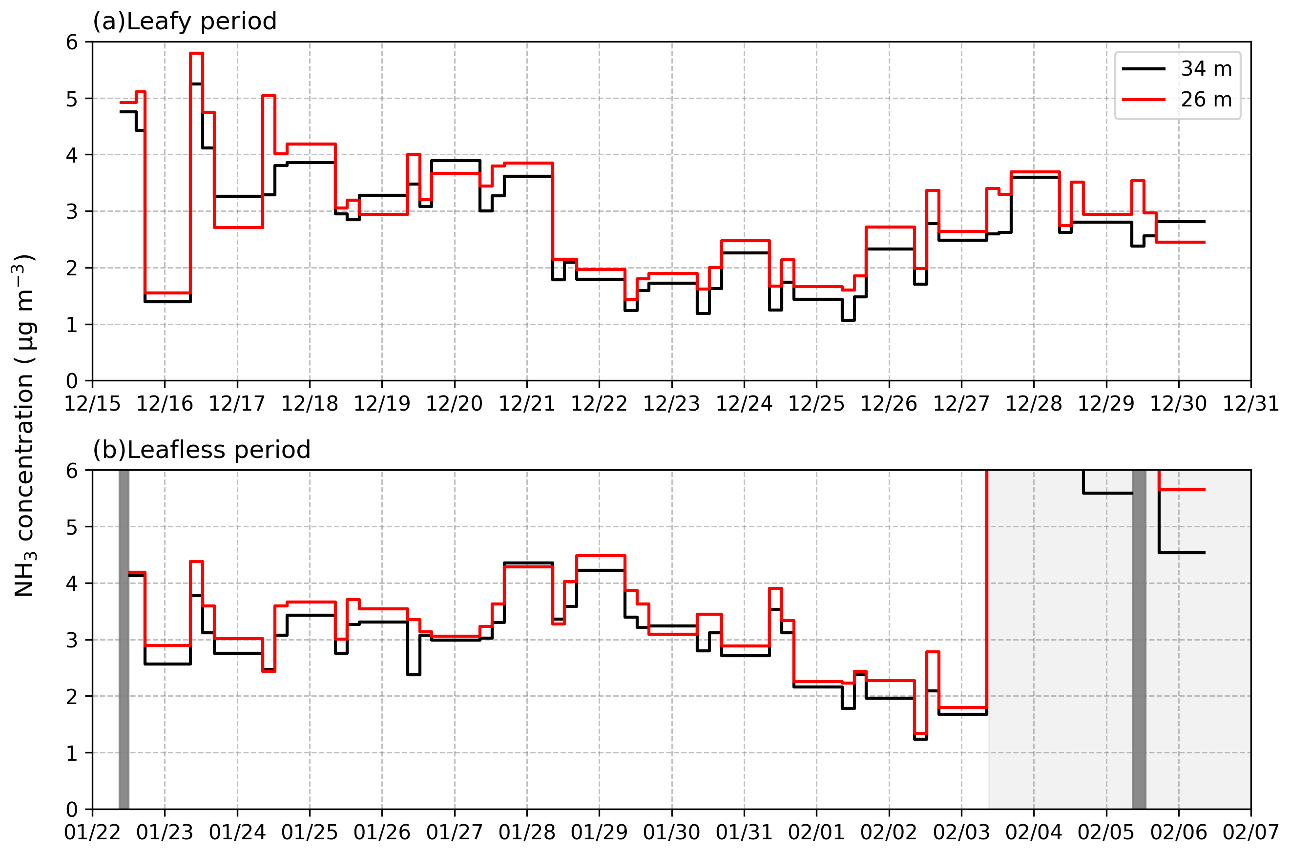 Figure 3Temporal variations in NH3 concentration at 34 m (black line) and 26 m (red line) during (a) the leafy and (b) leafless periods. The length of line indicates the duration of sampling. Gray hatches indicate missing data, and light gray hatch indicates the high concentration period during and after the forest fire around the observation tower. Data during the forest fire periods was not included in the analysis of this study. The range of concentration for the leafless period is aligned for the figure visibility.