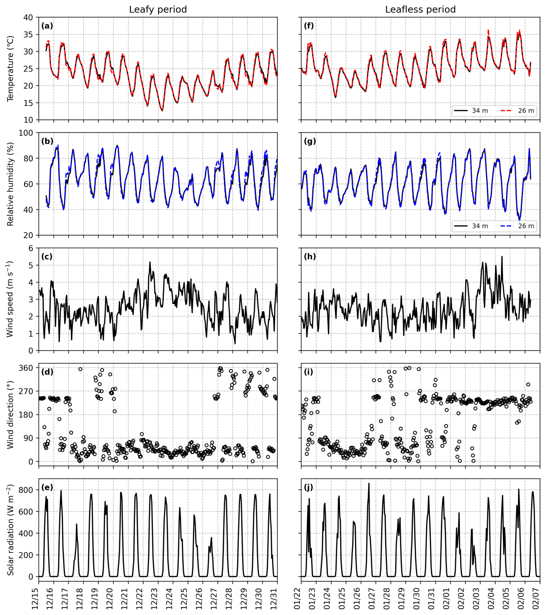 Figure 4Hourly variations in air temperature, relative humidity, wind speed, wind direction, and solar radiation during the leafy (a–e) and laeafless (f–j) periods. Air temperature and relative humidity were recorded at 34 m (solid line) and 26 m (dashed line), wind speed and wind direction were recorded at 31.5 m of the observation tower, and radiation was recorded above the ground, respectively.