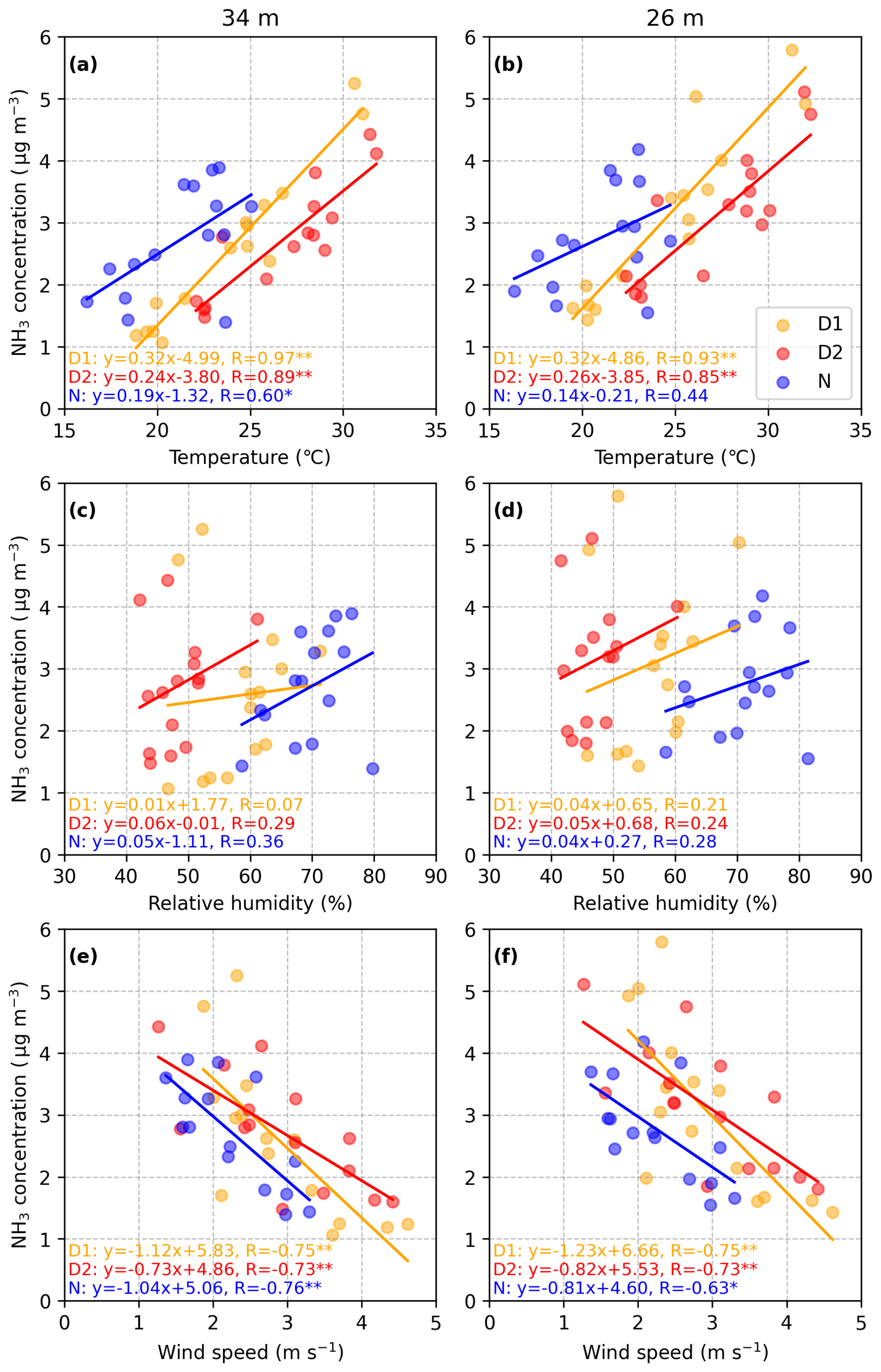 The relationships between the NH3 concentration and air temperature, relative humidity, and wind speed during the leafy period are shown in Fig. 5. The relationships between the concentrations at 34 and 26 m and meteorological elements were roughly the same. NH3 concentrations showed significant strong positive correlations with temperature during the D1 and D2; the correlation coefficients at 34 m were 0.97 and 0.89, respectively. In the 1-year vertical profile measurements at a Japanese deciduous forest using the denuder method, Xu et al. (2024) revealed that NH3 concentrations near the forest floor showed strong positive correlations with temperature on a weekly basis during the leafy period (LAI = 2.3–4.1). Osada (2020) measured hourly NH3 concentrations using a semi-continuous microflow analytical system in a Japanese urban area and found that daily NH3 concentrations have a strong relationship with the magnitude of temperature and may be affected by different processes during the daytime and nighttime. Our observations revealed that daytime NH3 concentrations were strongly controlled by temperature in the tropical DDF of Thailand, even at the shorter timescale of 4 h. Furthermore, the weaker correlation at nighttime (R = 0.60 at 34 m and R = 0.44 at 26 m) also indicates that the process controlling concentrations might change between daytime and nighttime. NH3 concentrations also showed significant negative correlations with wind speed during each sampling time; the correlation coefficients at 34 m were −0.75 (D1), −0.73 (D2), and −0.76 (N), respectively. This means that NH3 over the forest was dispersed when the wind speed was high and remained when the wind speed was low. While relative humidity ranged widely from 40 % to 80 %, no conspicuous correlation was found with NH3 concentration, suggesting that it was not the main factor controlling NH3 concentration in the DDF.