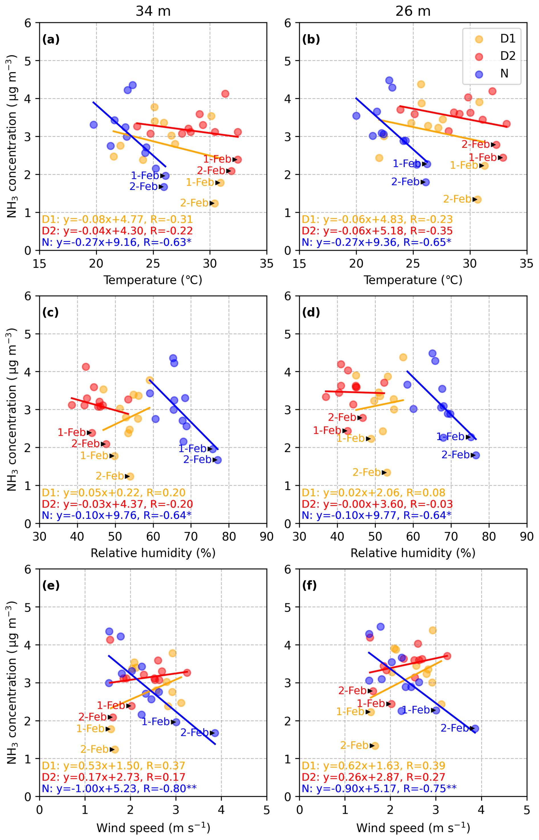On the other hand, there was no clear correlation between the concentrations at 34 and 26 m and the meteorological elements during each sampling time in the leafless period (Fig. 6), as can be seen in the leafy period (Fig. 5). Surprisingly, there seemed to be an opposite relationship, indicating that the concentration decreases with an increase in temperature at nighttime. This was possibly due to the change in wind direction (from northeast to southwest) in the leafless period, as mentioned above. The transition in monsoon from northeast to southwest typically induces higher temperature throughout Thailand, particularly in the northern and northeastern regions. During this period, the southwesterly wind might have brought a different air mass with low NH3 concentrations. The combination of increase in air temperature and low NH3 concentration at the end of the leafless period led to the negative correlations. In fact, the opposite relationship disappeared after excluding data from 1 February onward, and concentrations at 34 and 26 m showed a positive correlation with temperature during D1 (R = 0.57, 0.59). Moreover, the opposite nighttime relationship, which showed a decrease in concentration associated with increases in temperature and relative humidity, was less noticeable.