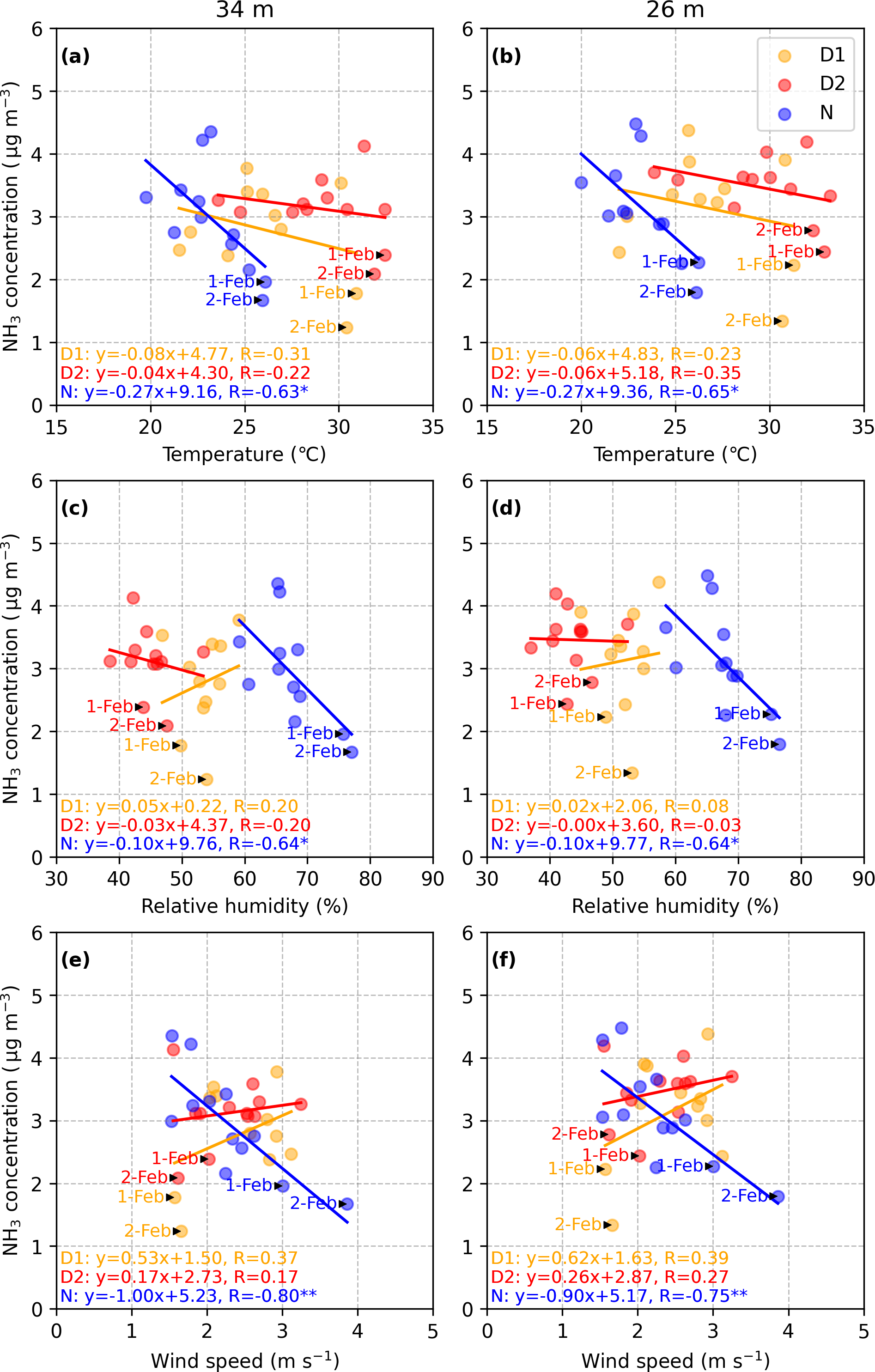 Figure 6Relationship between NH3 concentration at each height (34 m: (a), (c), (e); 26 m: (b), (d), (f)) and air temperature, relative humidity, and wind speed during the leafless period. ∗ and indicate significance levels of p < 0.05 and p < 0.01, respectively.