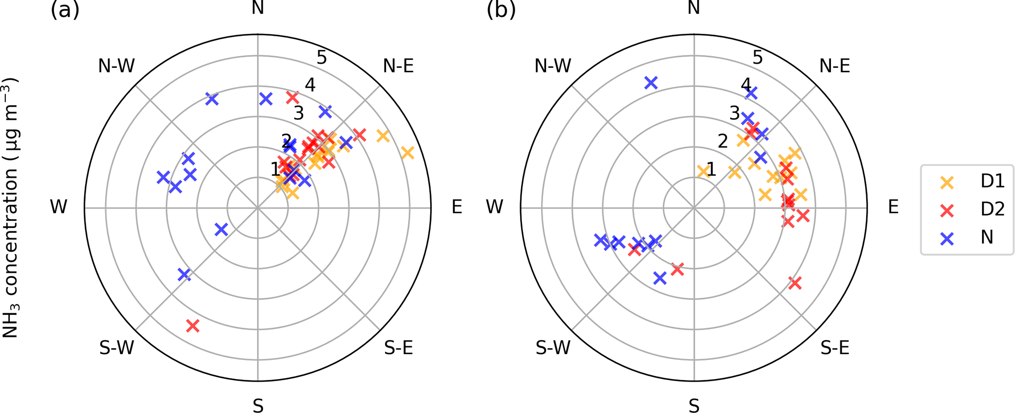 Figure 7The distribution of NH3 concentration at 34 m relative to the main wind direction at each sampling time during the leafy (a) and leafless (b) periods.