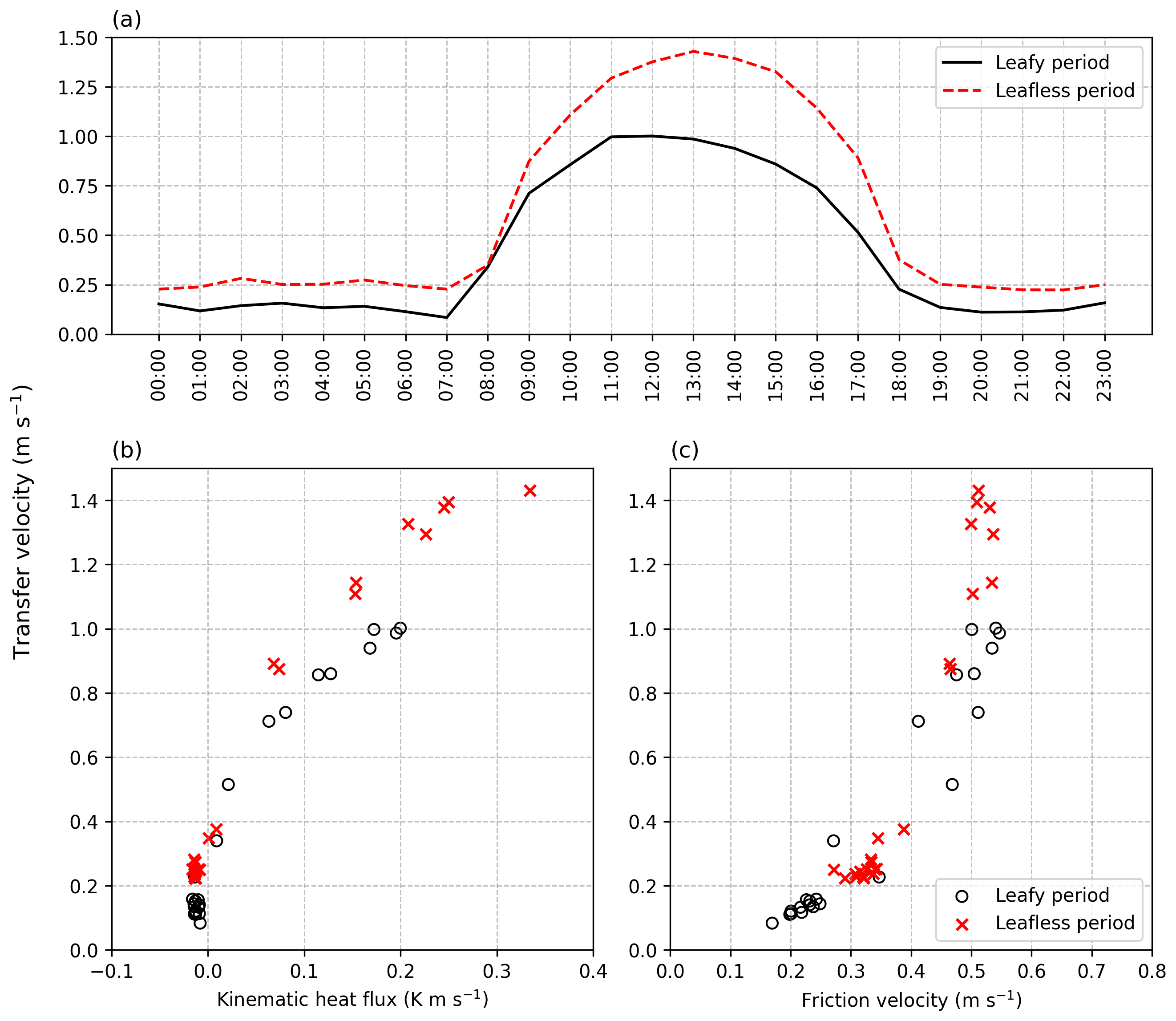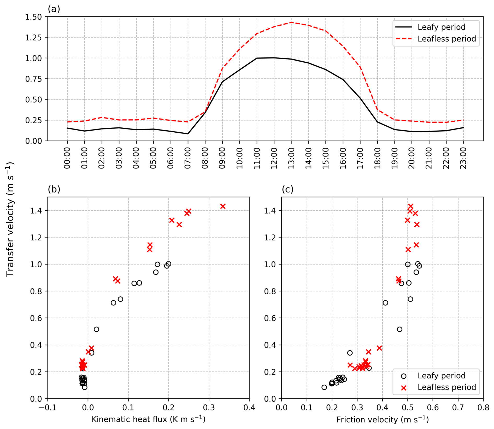 Figure 8Diurnal variation in the transfer velocity (a) and the relationship between transfer velocity with kinematic heat flux (b) and friction velocity (c) during the leafy (solid line and circles) and leafless (dashed line and crosses) periods. The 1 h ensemble mean values for each observation period are shown.