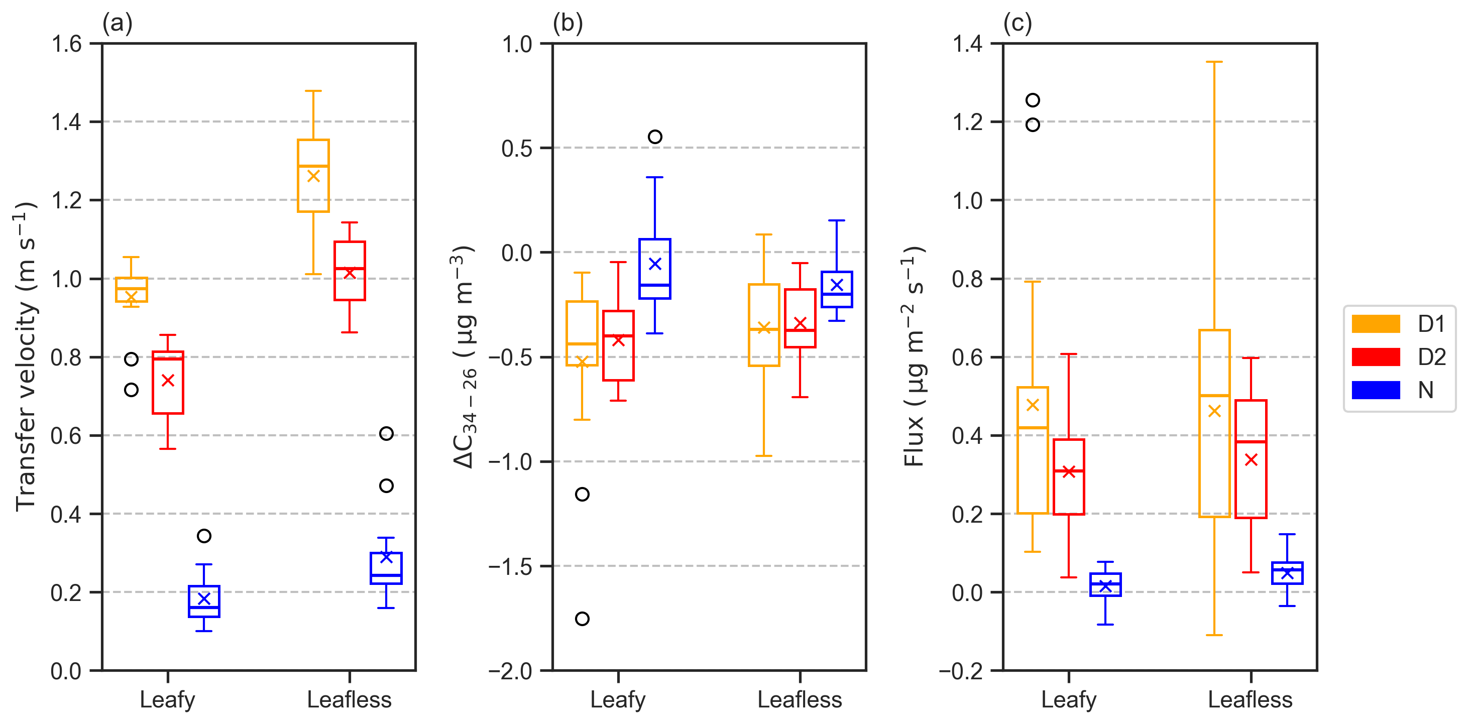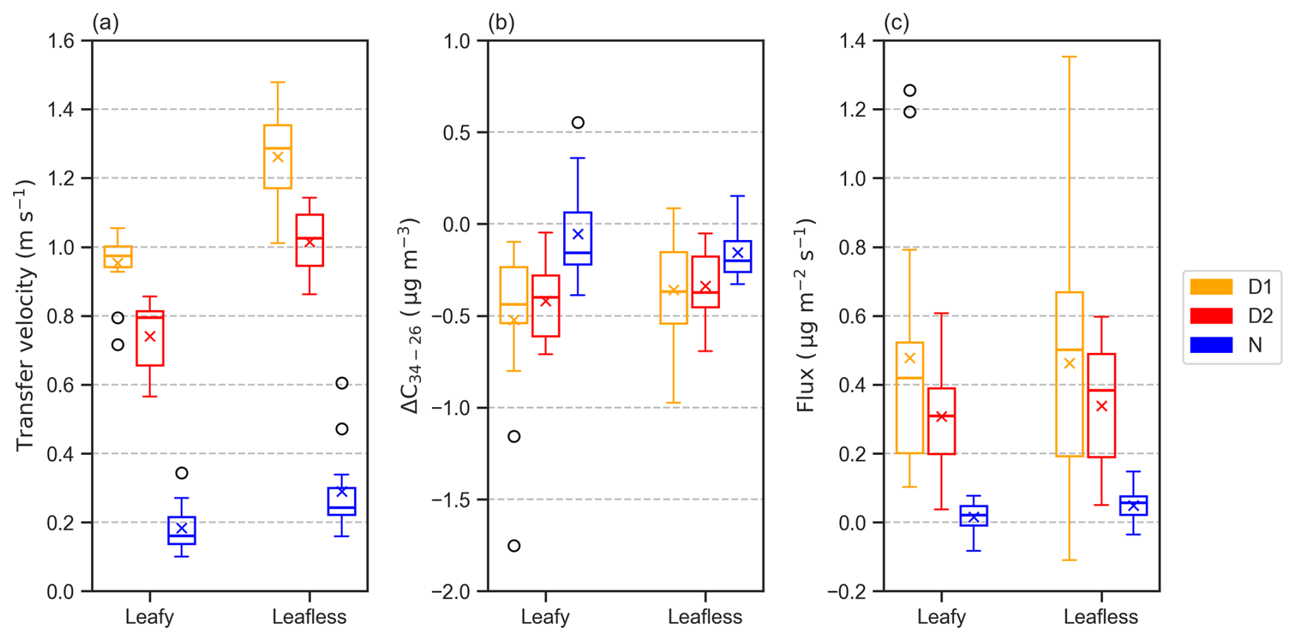Figure 9Distribution of transfer velocity (a), NH3 concentration difference between 34 and 26 m (b), and NH3 flux (c) at each sampling time during the leafy and leafless periods. Positive value of flux indicates emission and negative value indicate deposition. The range of boxes represent the interquartile range (IQR), with the median indicated by middle lines. Whiskers extend to 1.5 times IQR. Crosses indicate the mean values, and circles indicate samples exceeded 1.5 times IQR for each sampling time.