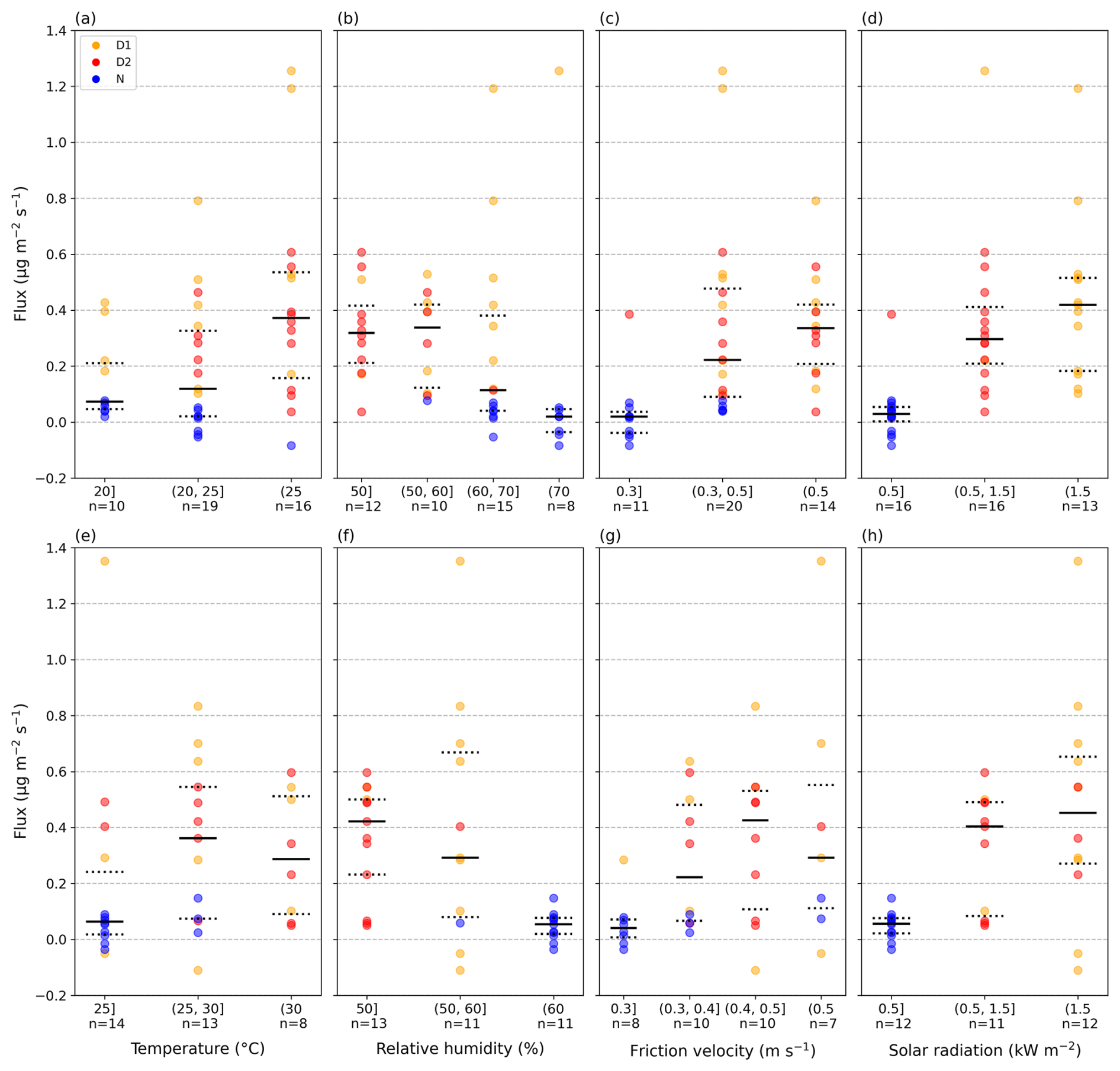 Figure 10Distribution of NH3 flux according to the range of air temperature (a, e), relative humidity (b, f), friction velocity (c, g), and solar radiation (d, h) at each sampling time (D1: orange, D2: red, N: blue) during the leafy (a–d) and leafless (e- h) periods. Solid line indicates median value and dashed lines indicate the 75th (top) and 25th (bottom) percentiles. Solar radiation was the integrated values of 1 h values during each sampling time.