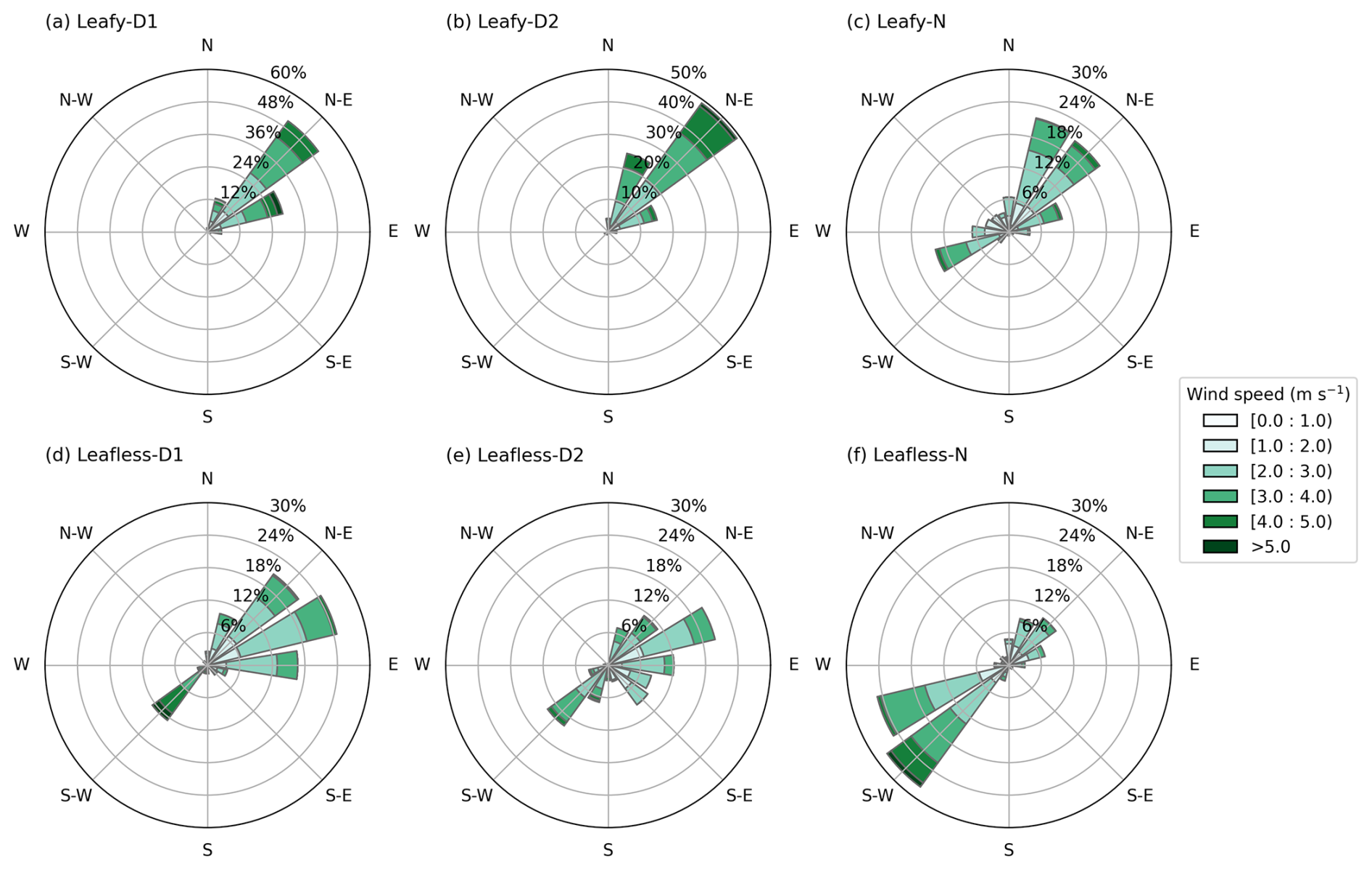 Figure A1Windrose at sampling time of D1 (a, d), D2 (b, e), and N (c, f) during the leafy (a–c) and the leafless (d–f) periods.