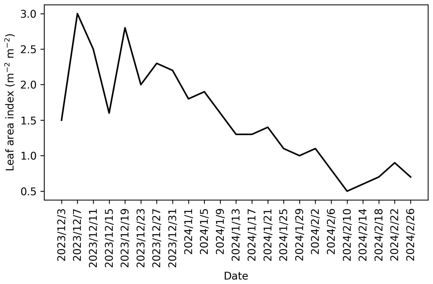 Since LAI was measured only once at the beginning of the observation period, we used the satellite-derived LAI to represent the temporal variation at the DDF of SERS. The satellite-derived LAI from December 2023 to February 2024 at the observation tower were obtained from the dataset of MCD15A3H, which is a product of the Moderate Resolution Imaging Spectroradiometer onboard the Terra and Aqua satellites (Myneni et al., 2015). The LAI values, 4 d composite data with a spatial resolution of 500 m, were obtained from the combined observations of both satellites. Based on the quality control of MCD15A3H, all data during the period were evaluated as best result possible with highest confidence.