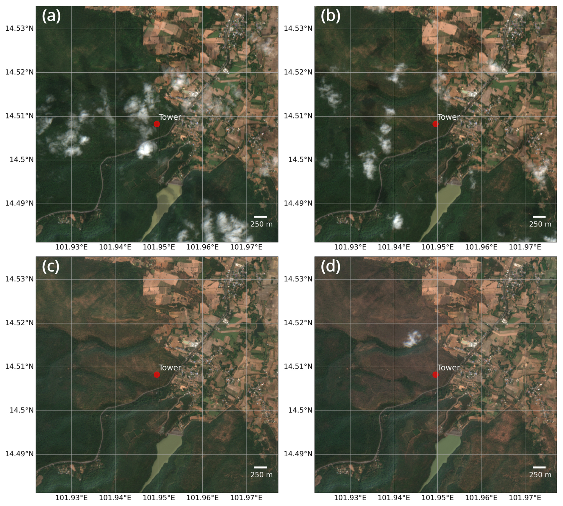Figure A3Satellite imagery (6 km × 6 km) of the observation site during four periods: (a) 15–31 December 2023; (b) 1–10 January 2024; (c) 11–21 January 2024; and (d) 22 January–7 February 2024. The images were retrieved from the dataset of Sentinel-2 Surface Reflectance Harmonized (COPERNICUS/S2_SR_HARMONIZED) via © Google Earth Engine. For each period, imagery was filtered for the observation site, and scenes with cloud cover below 20 % were selected.
