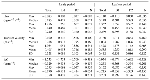 Figure 9 shows the distribution of transfer velocity, ΔC, and NH3 flux at each sampling time during the leafy and leafless periods. The mean and median values for each item during the daytime and nighttime were almost the same. Transfer velocity was in the range from 0.10 to 1.48 m s−1, and tended to be higher during the daytime and in the leafless period. The weighted means and standard deviations of transfer velocity by sampling time were 0.40 ± 0.33 and 0.56 ± 0.41 m s−1 during the leafy and leafless periods, respectively. The weighted mean value of the transfer velocity during D1 was approximately four times higher than that during N. ΔC was in the range from −1.75 to 0.56 µg m−3, and there was little difference between observation periods except for some variations during the leafy period. The weighted means and standard deviations of ΔC by sampling time were −0.19 ± 0.35 and −0.21 ± 0.20 µg m−3 during the leafy and leafless periods, respectively. In contrast to the little difference between leafy and leafless periods, ΔC showed a large diurnal variation. Although the difference was smaller compared to that of transfer velocity, the absolute values of mean and median ΔC at daytime were larger than those at nighttime. Flux was in the range from −0.110 to 1.352 µg m−2 s−1, and the absolute values had a clear trend to be larger at daytime reflecting the characteristics of transfer velocity and ΔC. However, no clear difference was observed between the two periods as the transfer velocity. The weighted means and standard deviations of flux by sampling time were 0.140 ± 0.240 and 0.158 ± 0.239 µg m−2 s−1 during the leafy and leafless periods, respectively. As described in Sect. 3.2, there were significant changes in some meteorological elements and canopy conditions between the leafy and leafless periods. However, regardless of the observation period, NH3 showed consistent pattern of air-forest exchange, with large emissions at the daytime, and small emissions and depositions at nighttime. The weighted mean and standard deviation of NH3 flux for the entire observation period was 0.148 ± 0.240 µg m−2 s−1, indicating that the tropical DDF of SERS acted as a source of NH3 during the dry season. Statistical summary of transfer velocity, ΔC, and NH3 flux is shown in Table A2.