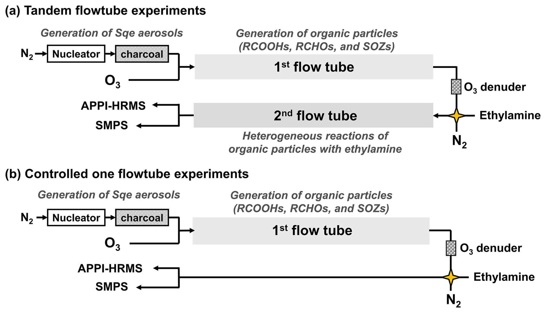 An integrated experimental system employing a tandem flowtube reactor coupled with APPI-HRMS was developed to examine the heterogeneous reactions between target organic aerosols upon ethylamine exposure, as illustrated in Fig. 1a. The apparatus contains three key components: (i) in-situ generation of organic particles in the first flowtube reactor from the ozonolysis of Sqe aerosols, (ii) controlled multiphase reactions between organic particles and ethylamine in the secondary flowtube reactor, and (iii) online monitoring of chemical compositions of organic particles as a function of ethylamine exposure. To isolate the contribution of heterogeneous reactions in the secondary flowtube reactor (Fig. 1a), the controlled experiments were conducted using a single flowtube configuration, as illustrated in Fig. 1b.