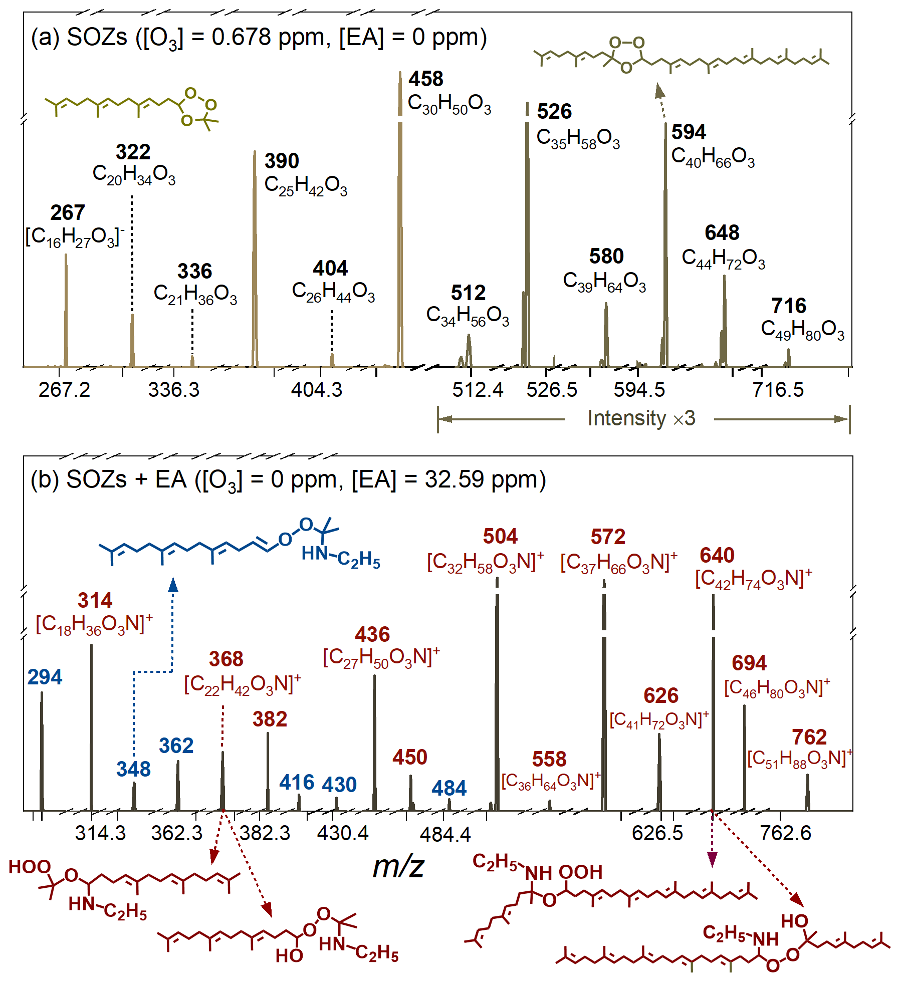 Figure 3Mass spectra of (a) representative SOZs (the signals within range of 500–800 are amplified) formed during the ozonolysis of Sqe in the first flowtube reactor, and (b) their amination products (adducts of SOZ + EA are in red and dehydration products are in blue) upon exposure to ethylamine (EA) in the secondary flowtube reactor.