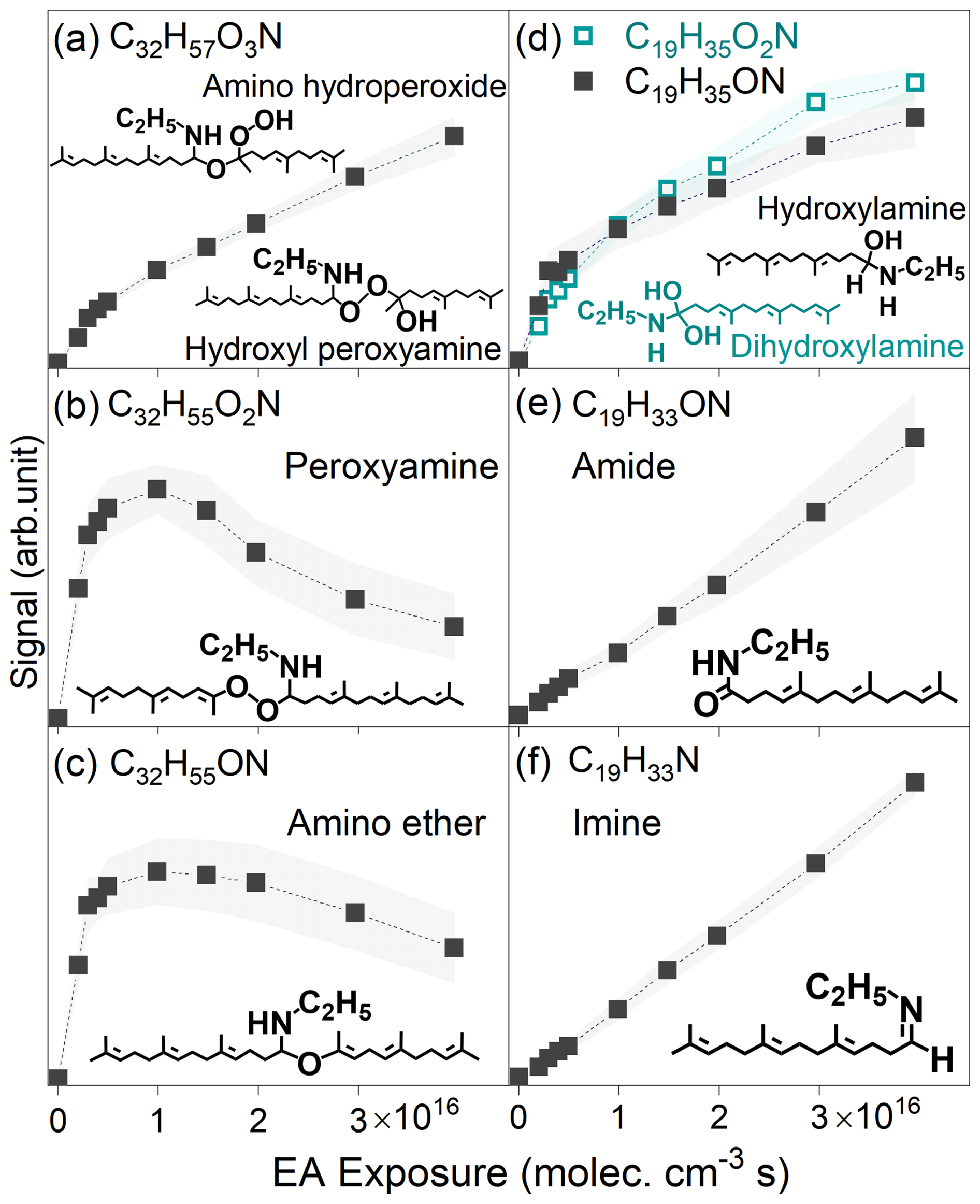 Figure 6Experimental signal as a function of ethylamine (EA) exposure for: (a) hydroxyl peroxyamine (or amino hydroperoxide), (b) peroxyamine, (c) amino ether, (d) dihydroxylamine and hydroxylamine, (e) amide, and (f) imine.