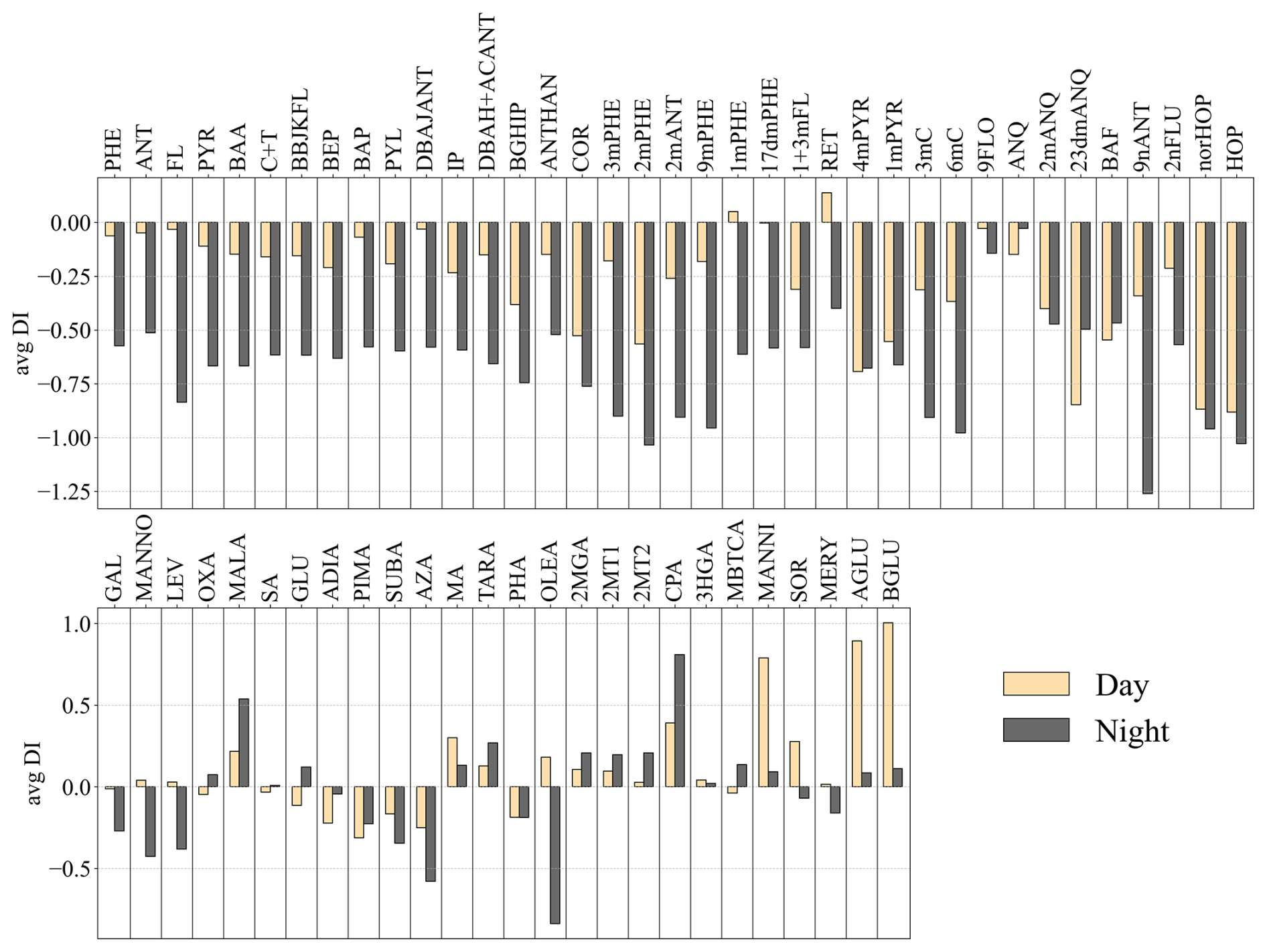Figure 2Average decreasing indexes (DI) for day and night sampling periods. Negative DI indicate higher concentration at the city site. Abbreviations are defined in Table 1.