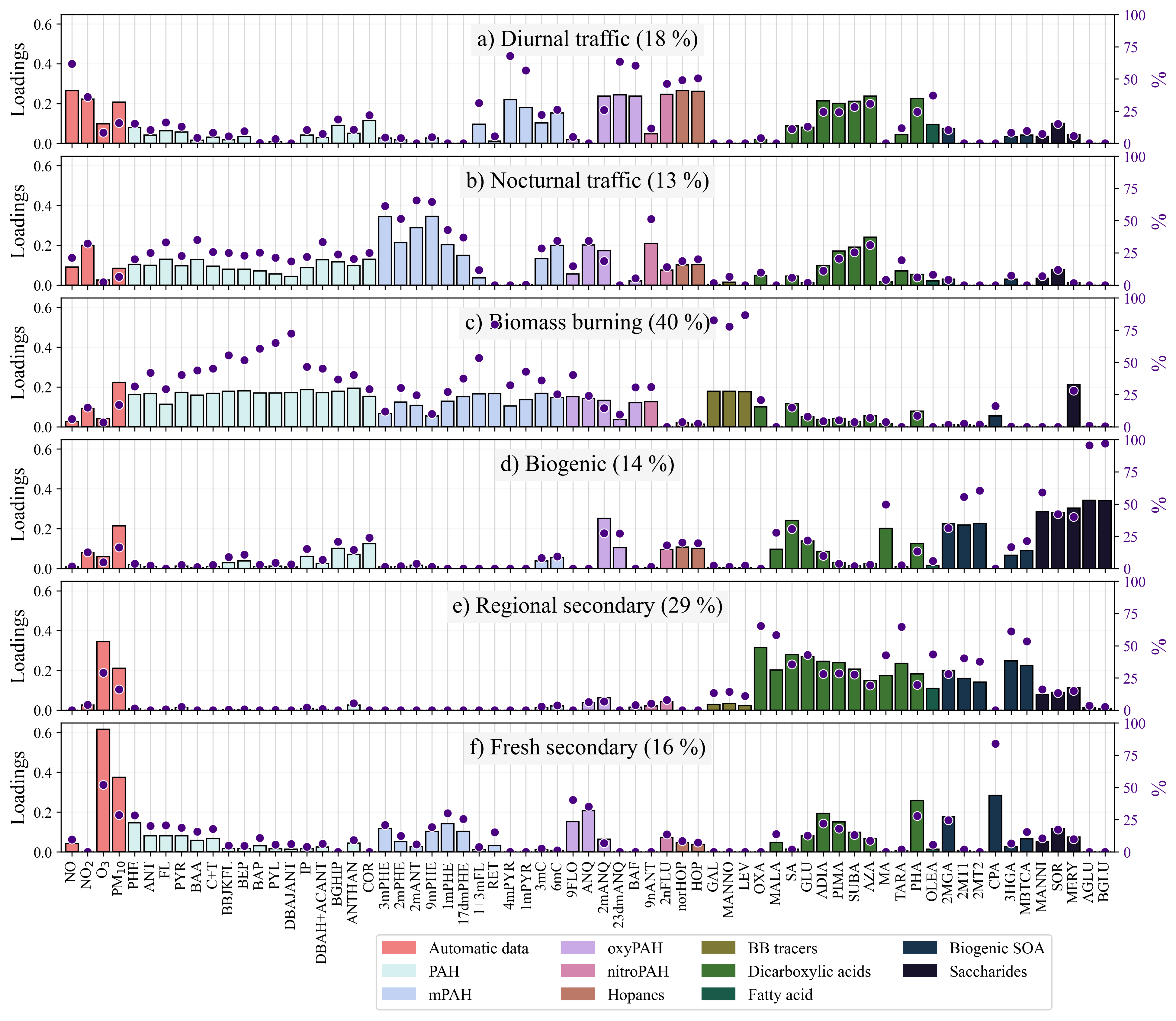 The multi-variant analysis by MCR-ALS was applied on the joined dataset, and included the organic markers in PM10 samples, as well as the average concentrations of the air quality parameters NO, NO2, O3, and PM10 for the sample periods. This was done in order to study the similarities and differences among the quantified compounds and sampled sites and to identify the most significant sources and atmospheric processes influencing air quality in the sites without pretending to be a mass balance for PM, or the organic aerosol. The analysis resolved six components based on their chemical composition in relation to their environmental interpretability. Those components explained 95 % of the variance in the dataset. The components are represented in Fig. 3 showing the loadings of each compound in each component (bars) and the percentage of the compound present in the specific component as the proportion of the compound along all components (purple dots). Moreover, Fig. 4 shows the score of the resolved components in each sample. The six components are as follows: