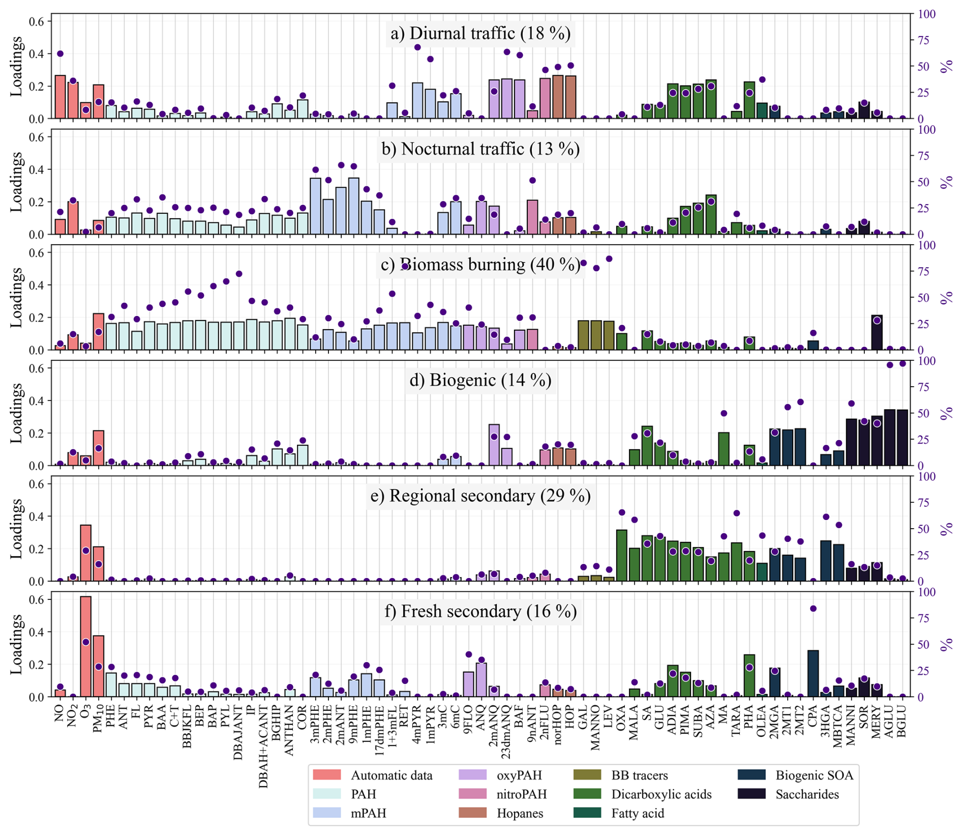 The polar fraction, excluding saccharides, is related with the secondary and biogenic components. In particular, most of the DCA and oleic acid have a regional origin, 39 % and 43 %, respectively, while biogenic SOA compounds (isoprene and α-pinene SOA) are more uniformly distributed between the non-combustion sources. Finally, the glucoses and fungal markers have almost solely relevant loadings from the biogenic component with percentages from 42 % to 97 % in this component.