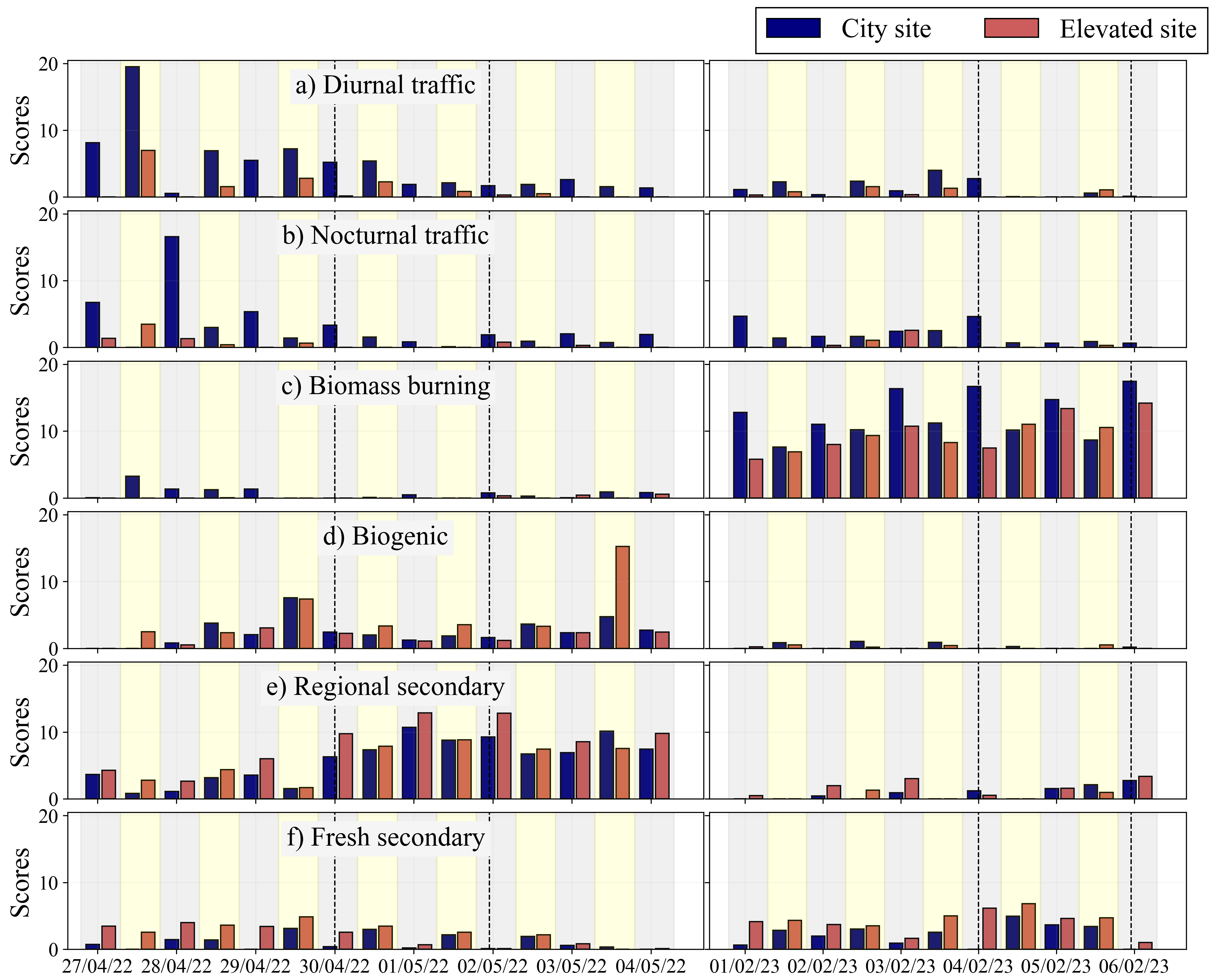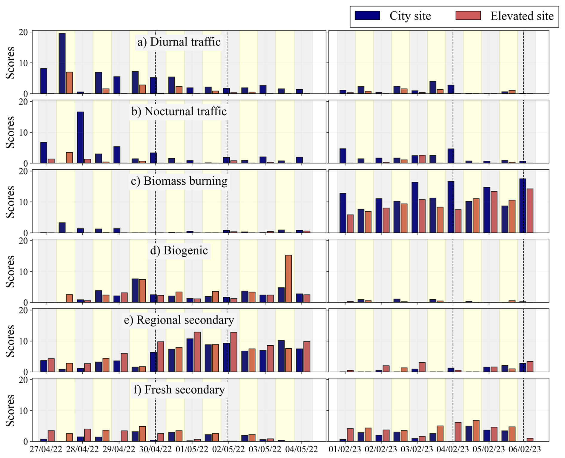 The higher score values were observed on days with continental air masses (Fig. S3b) supporting a regional origin of this aged secondary component. In general, the score values in the two sites followed similar trends (Fig. 4). However, during the day, mixing was more uniform in the urban airshed, while at night, scores were higher at the elevated site, indicating either faster depletion in the city, or long-range atmospheric transport and formation within the ozone reservoir above the urban airshed (Jaén et al., 2021a).