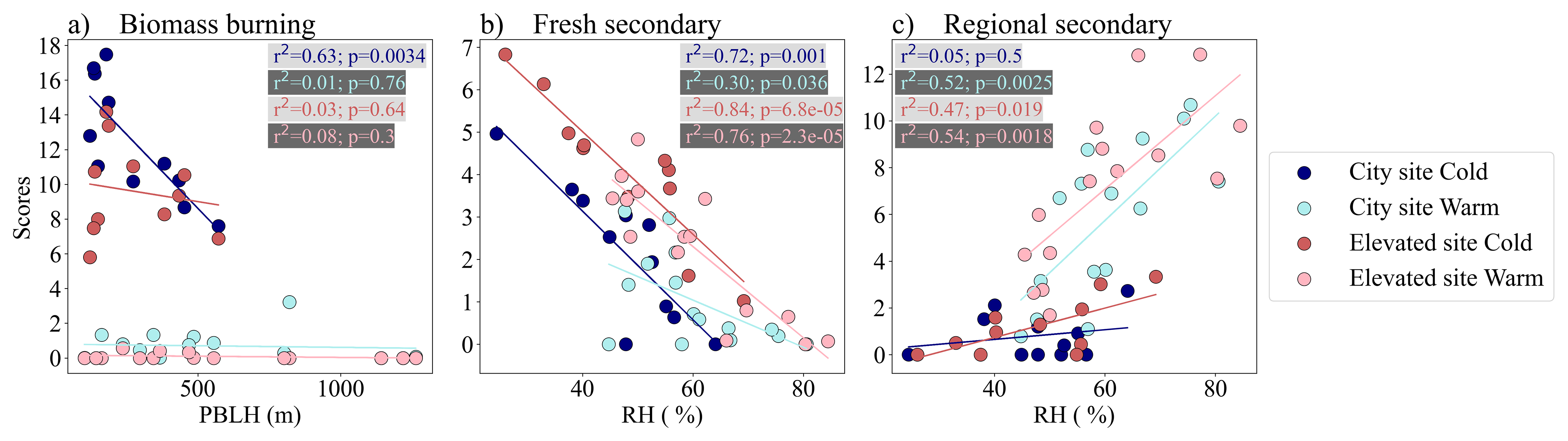 On the contrary, the Nocturnal traffic component does not show a significant correlation between sampling sites with substantial higher scores at the city site. This decoupled behaviour between altitudes suggests the accumulation of this traffic related component in the nocturnal urban atmosphere in absence of turbulent mixing in nighttime period. The score values of the biomass burning in the urban area at city level in the cold period were anti-correlated with the planetary boundary layer height (PBLH; r2=0.63; p=0.003; Fig. 5). This anti-correlation was not observed at the elevated site, and suggest local emissions in the elevated site, and input of biomass burning emissions and accumulation in the urban airshed for the city site.