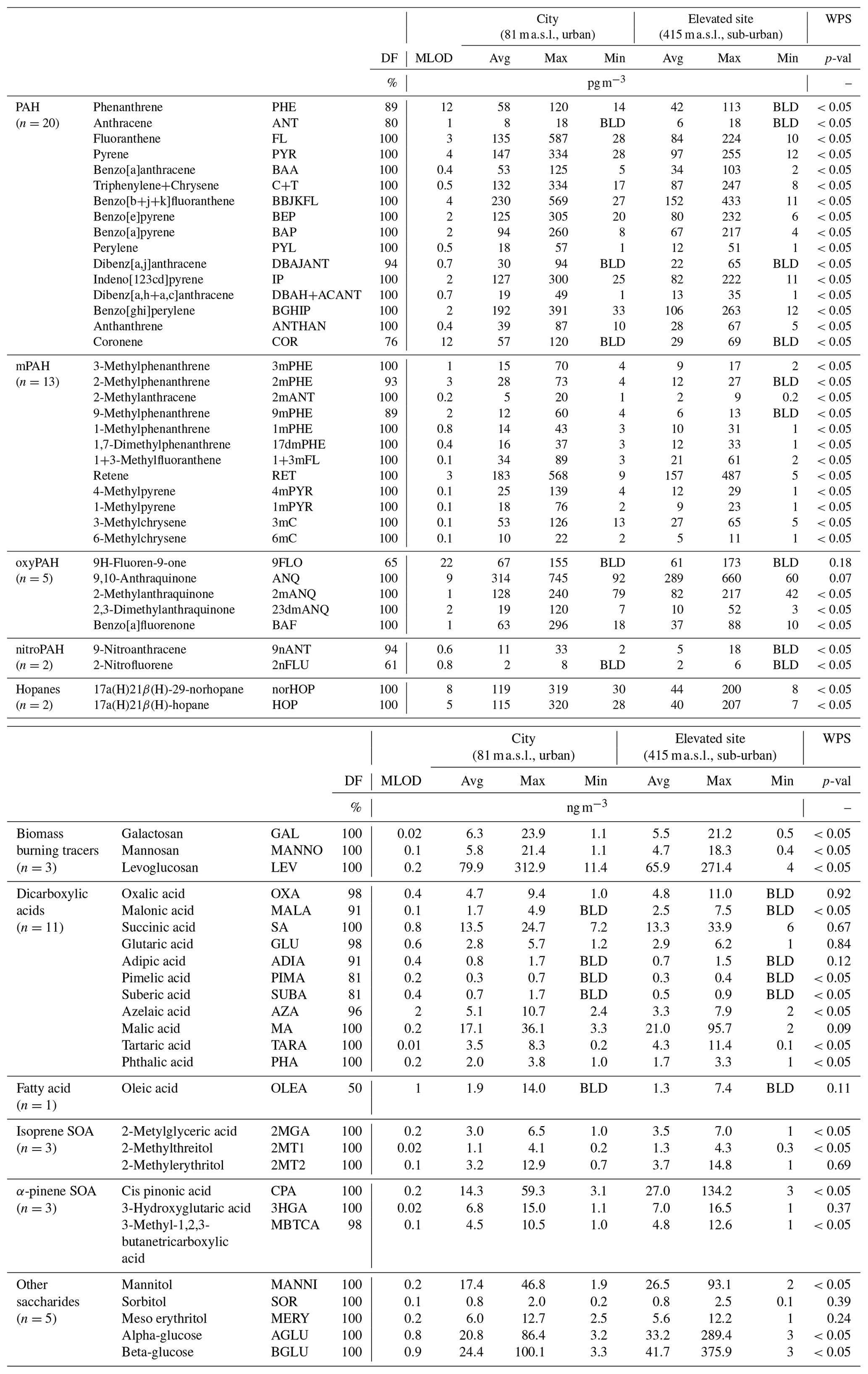 Table 1 shows detection frequencies (DF), MLOD, average, maximum and minimum concentrations at the city and elevated background sites and p-values for the Wilcoxon test for paired samples (WPS) between both sites, and average day and nighttime concentrations are given in Table S1 in the Supplement. The magnitude of these differences between sites are evaluated by calculating the Decreasing Index for each compound in each pair of samples as following: ; where i is the specific pair of samples, and n the total number of samples. The average DIs for day and night samples are shown in Fig. 2.