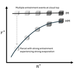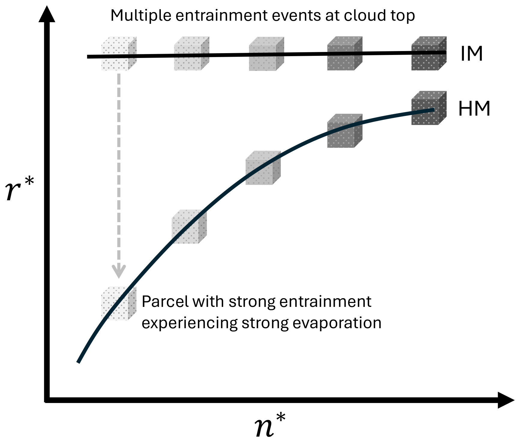 Figure 10Illustration of the IM-HM transition within Sc from the bulk perspective. Parcels with darker (lighter) shading corresponds to samples with lower (higher) entrainment fractions. The horizontal black line represents the IM behavior occurring near cloud top, the curved line represents the HM behavior occurring within cloud.