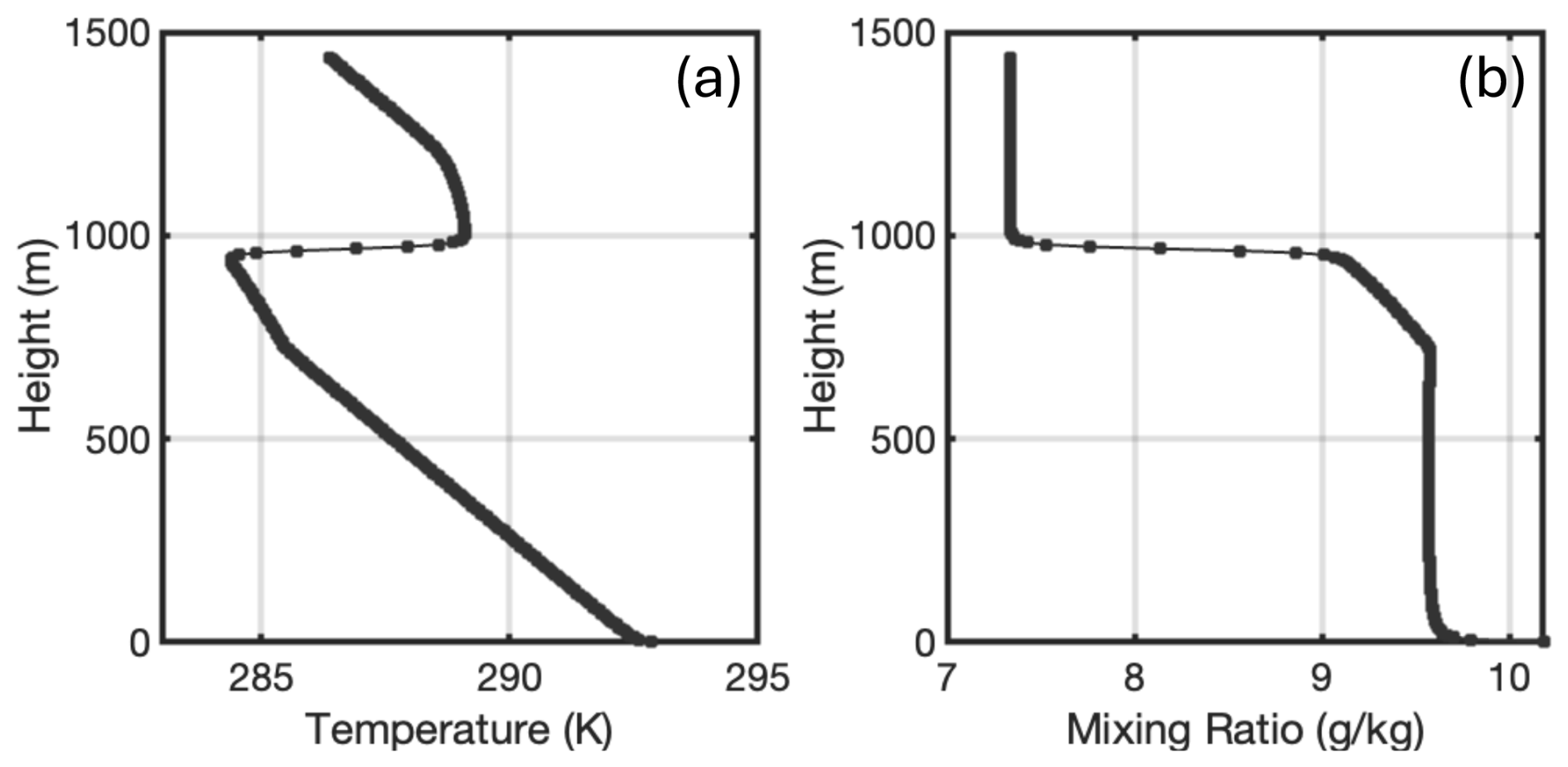 Figure 2The idealized (a) temperature and (b) mixing ratio profiles based on the sounding observation at 05:30 UTC on 30 June 2017 during the ACE-ENA field campaign.