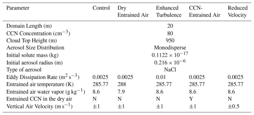 To drive the simulations, the idealized thermodynamical profile (Fig. 2) is constructed from the observations on 30 June 2017 during the Aerosol and Cloud Experiments in the Eastern North Atlantic (ACE-ENA) field campaign (Wang et al., 2022). It is noted that a strong inversion layer exists at 950 m, defining the cloud top height in Table 1. For the Control simulation, the Eddy Dissipation Rate (EDR) is adapted from the in-situ observation as 0.0025 m2 s−3, representing a typical Sc environment. The thermodynamics of the entrained air is estimated as the parcel at 10 m above cloud top experiencing adiabatic descent to cloud top. Particularly, the entrained air temperature and water vapor is estimated as 285.77 K and 8.6 g kg−1. In addition to the control case, four sensitivity simulations were conducted to evaluate the robustness of the experimental design. The Dry Entrained Air experiment represents the scenario in which the entrained air is drier. Specifically, the model setup is the same as the control one except the entrained air property is using the parcel at 20 m above cloud top experiencing adiabatic descent to cloud top. The selection of the distance of the entrained parcel from cloud top is arbitrary and does not affect the conclusions of this study. The Enhanced Turbulence experiment simulates stronger turbulent environment with EDR set to 0.01 m2 s−3. The CCN entrained Air experiment allows the entrained air containing dry aerosols entrained from free atmosphere. The properties and concentrations of the entrained aerosols are identical to those initially specified within the parcel. Finally, the Reduced Velocity experiment represents parcels subjected to a smaller vertical velocity than in the control case. A complete summary of the model configurations for these sensitivity experiments is provided in Table 1.