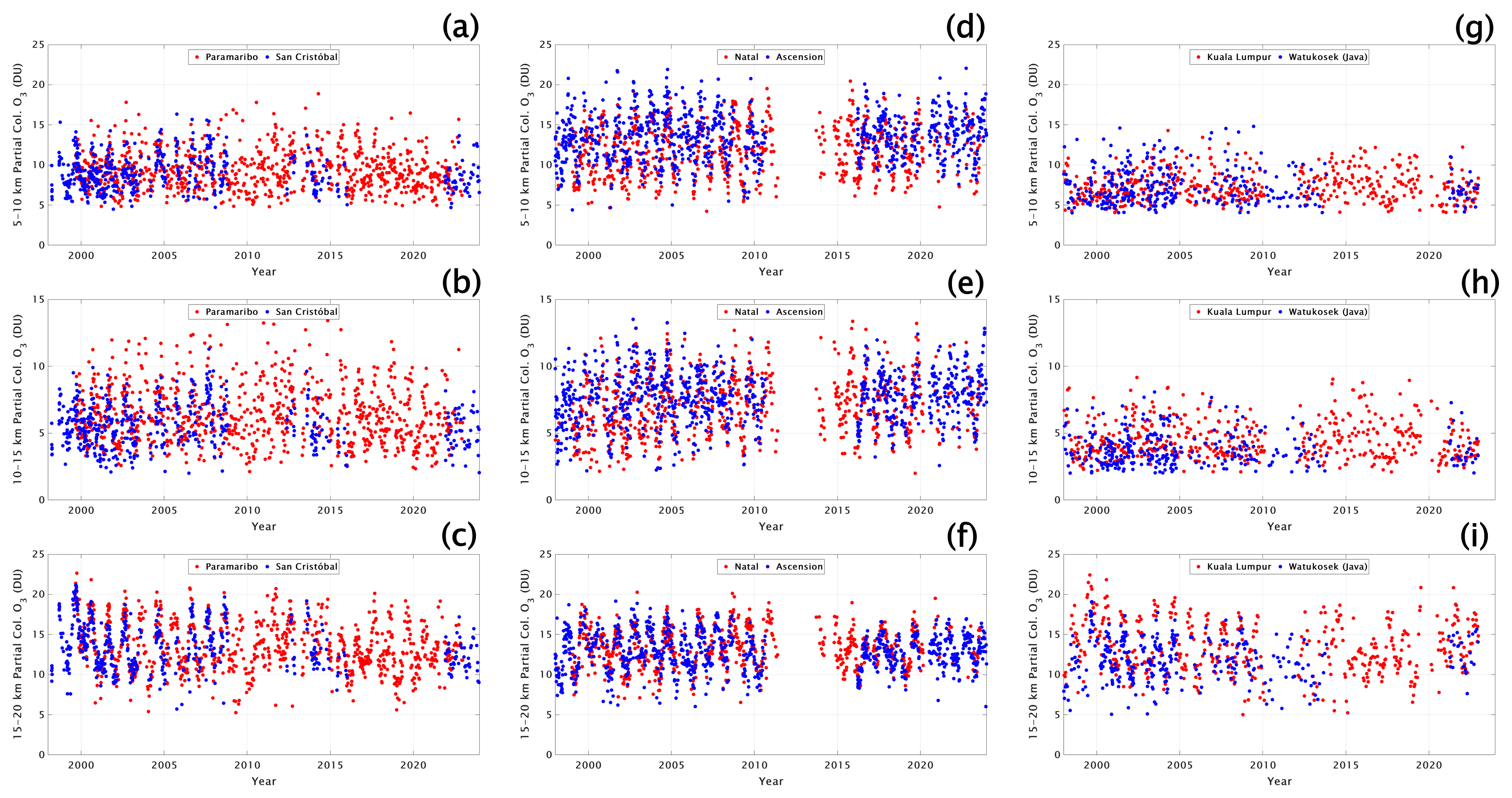 Figure 2Time series of ozone column segments (in DU) for the combined SHADOZ stations, for the layers 5–10, 10–15 and 15–20 km for San Cristóbal–Paramaribo (a–c), Natal–Ascension (d–f) and Kuala Lumpur–Watukosek (Java) (g–i). Station coordinates in Table 1.