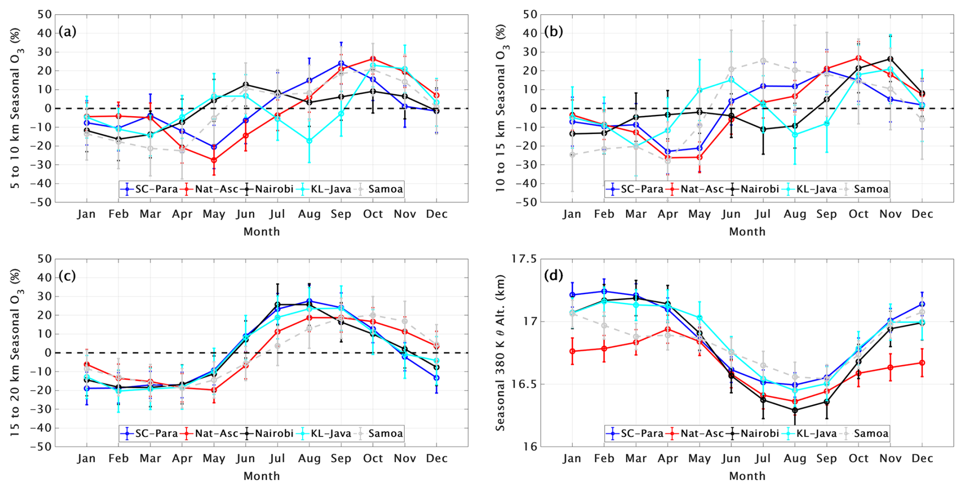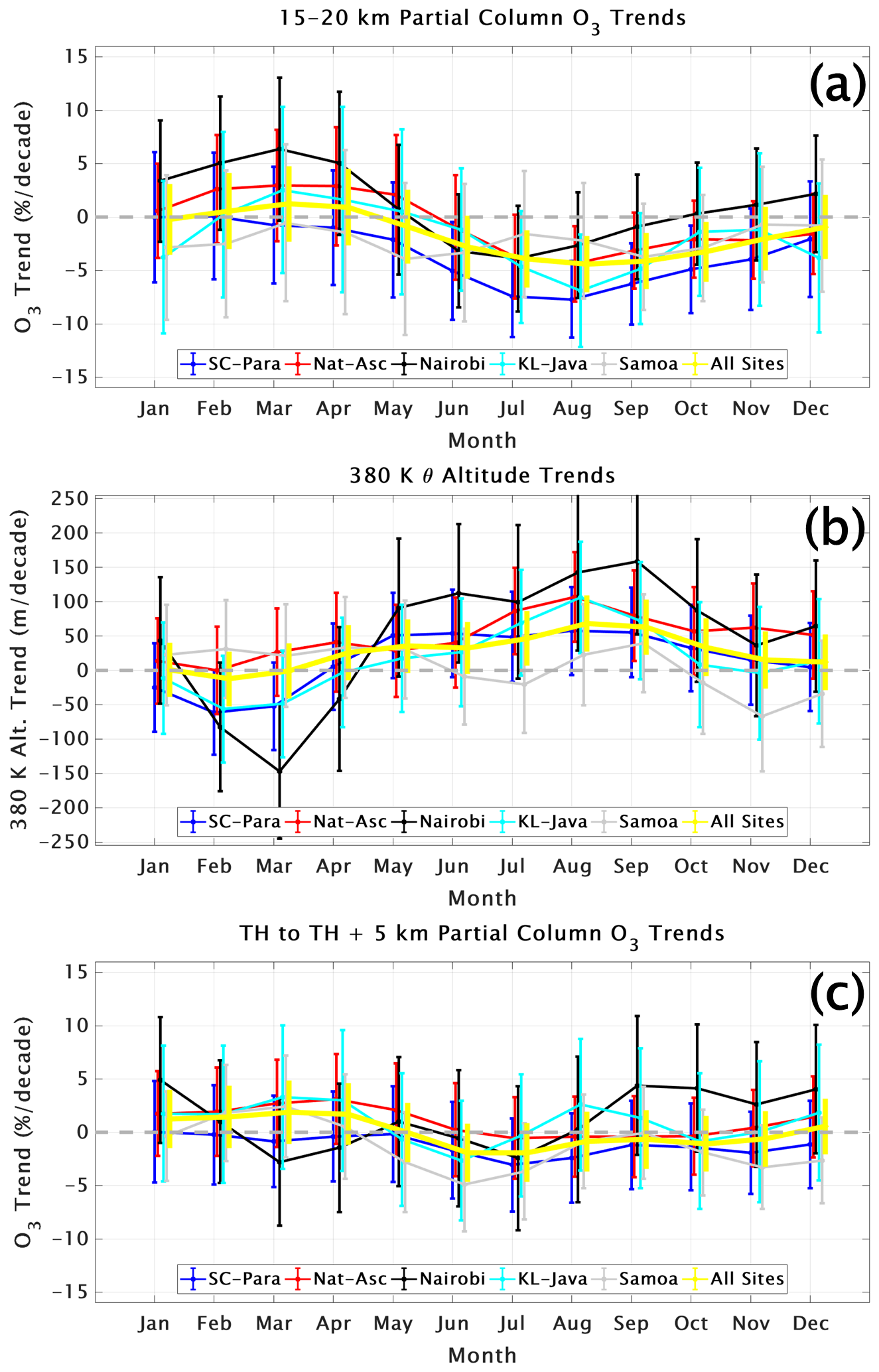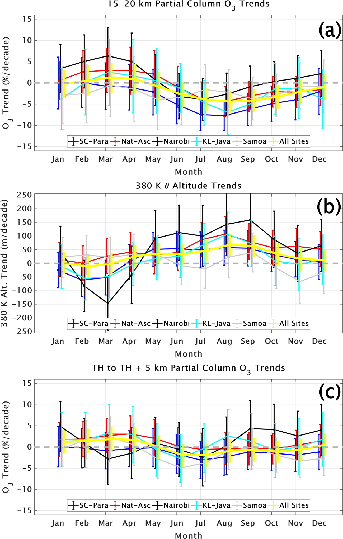 Annually averaged trends, 2005–2023, determined with MLR for OMI/MLS columns, TrCOsatellite, over the eight individual equatorial SHADOZ stations (members of the five combined sites) and TrCOsonde overlap within the uncertainties of each. Trends are close to zero at Nat-Asc, Nairobi and KL-Java. The OMI/MLS TrCOsatellite trends are marginally positive at SC-Para, with monthly cycles diverging in the early part of the year at SC-Para. OMI/MLS trends do not capture large monthly seasonal variations seen in SHADOZ profiles, especially for negative trends. The large positive trend from OMI/MLS over Samoa does not align with determinations of FT ozone from this or other studies (see below).