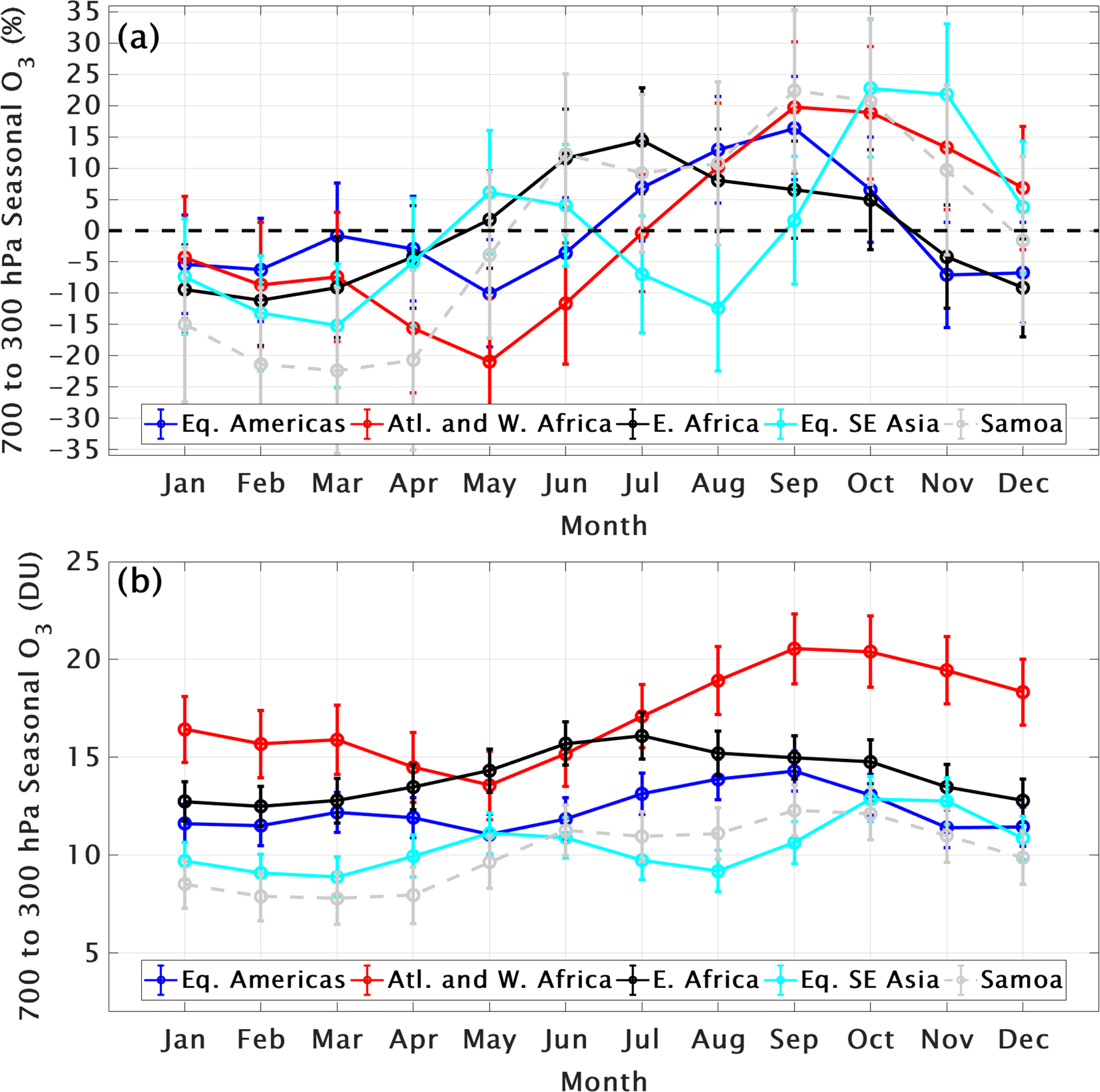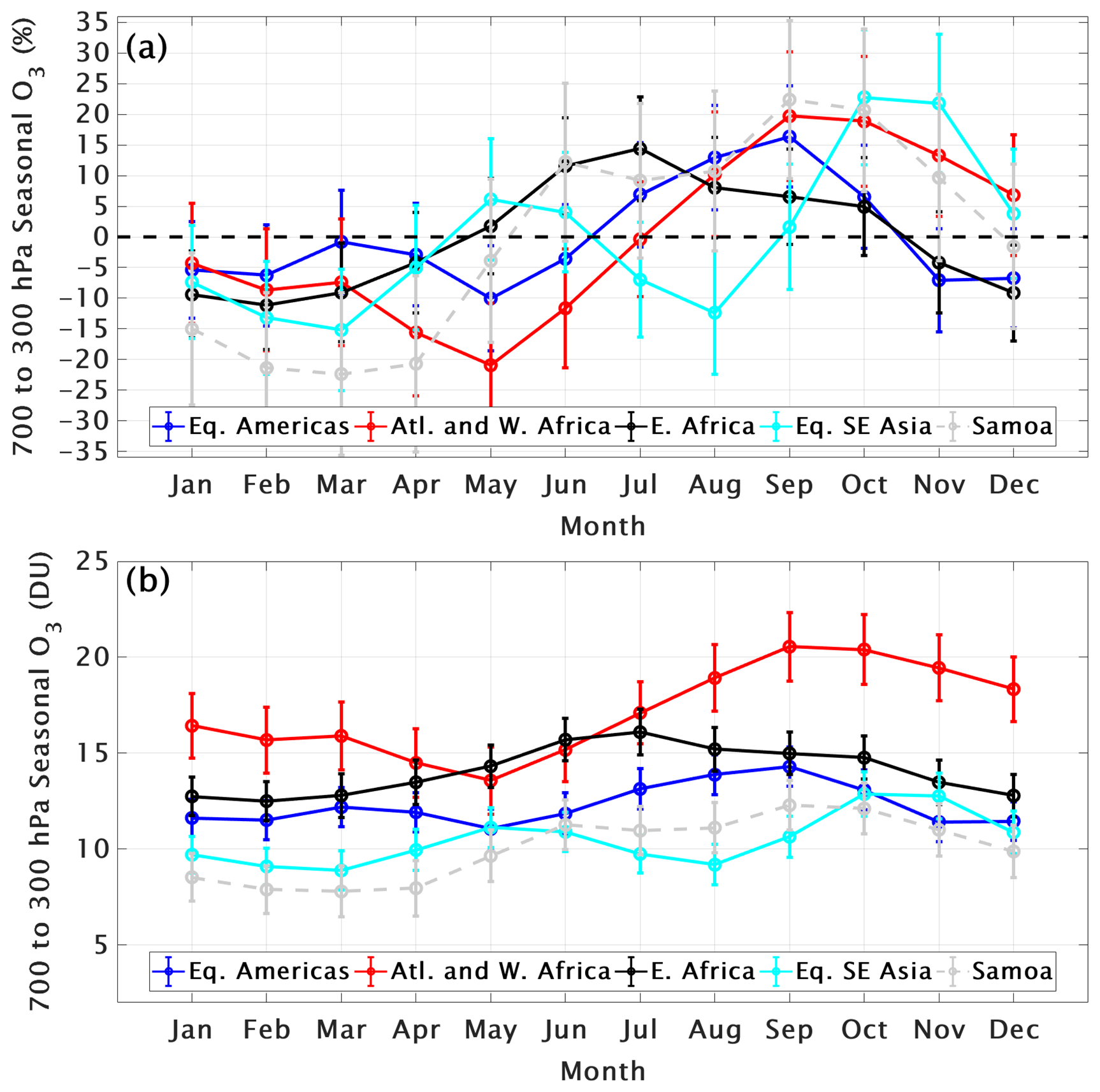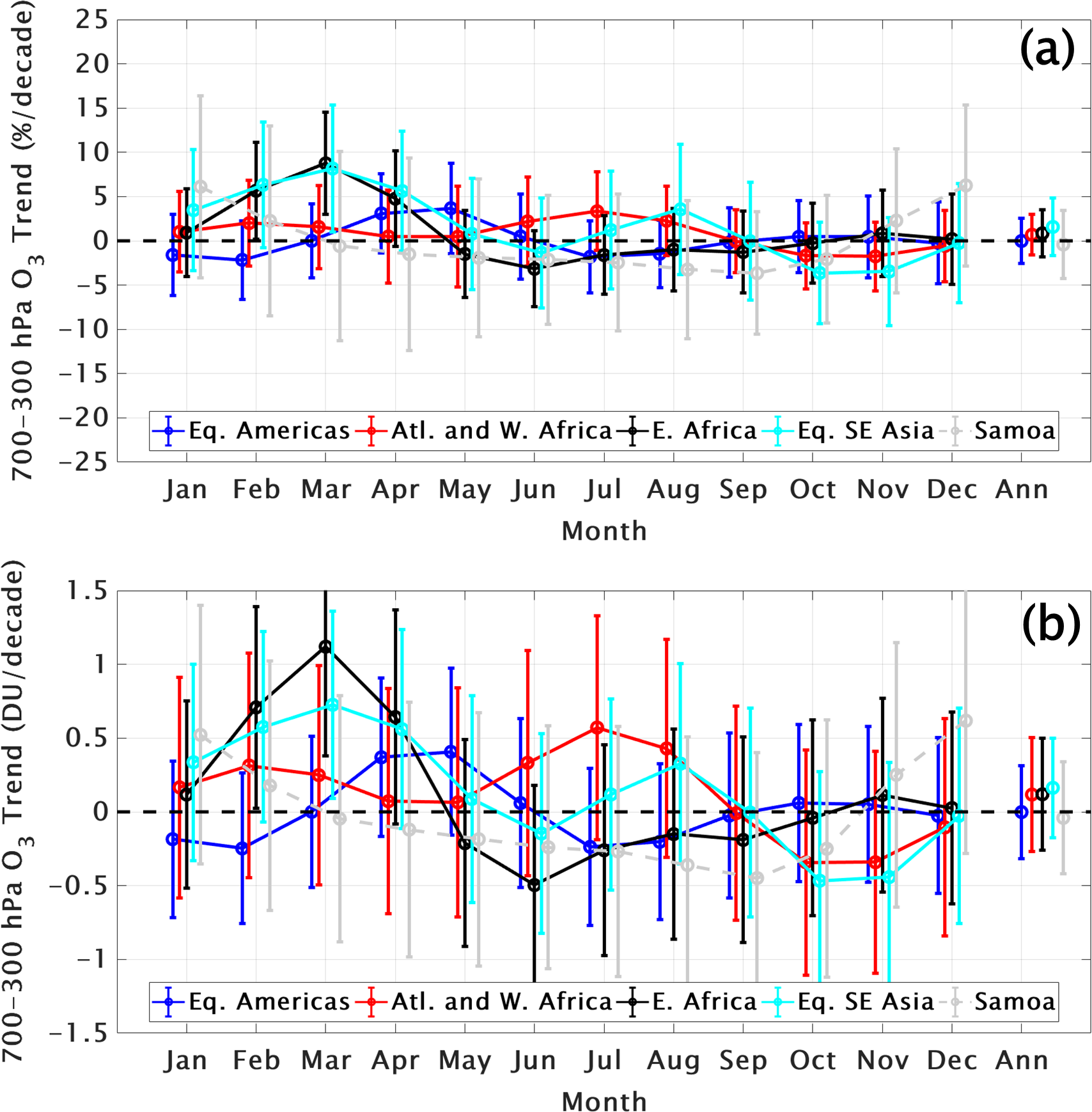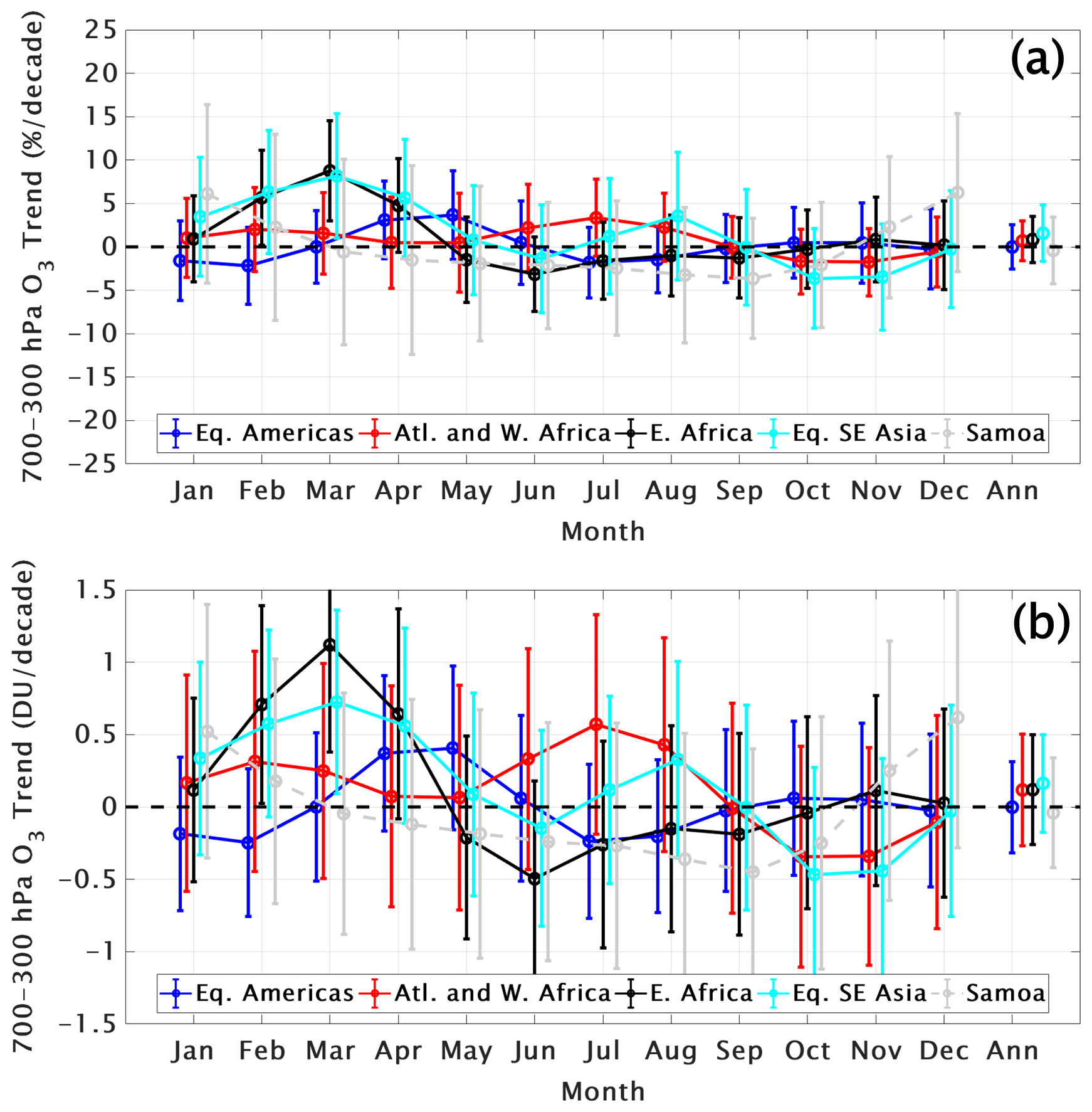 Early in the TOAR II study period we analyzed ozone profiles in the tropics collected in the Southern Hemisphere Additional Ozonesondes (SHADOZ) network (Thompson et al., 2003, 2017) to compute FT and LMS ozone trends. The results in T21 are based on data from eight combined SHADOZ stations within ± 15° latitude; the Goddard Multiple-Linear Regression (MLR) model calculated trends from 1998 through 2019 from the surface to 20 km. Changes in individual layers between 5 and 15 km were typically (5–10) %/decade but only seasonally; over the equatorial SE Asian stations at Kuala Lumpur and Watukosek, Indonesia, some layers displayed increases up to 20 %/decade (Fig. 6 in T21). However, in general, annually averaged changes in equatorial regions ranged from ∼ 0 to +(1–2) %/decade or −(1–2) %/decade. In T21 LMS ozone (LMS defined as within 15–20 km) computed with the MLR model displayed a seasonal loss up to 10 %/decade (July through September) or to 3 %/decade, annually averaged. The loss maximized at ∼ 18 km. At the same time of year, a positive trend in tropopause height (TH), derived from the SHADOZ radiosondes, was detected. Redetermining LMS ozone changes in the 5 km column above the tropopause zeroed out the apparent trend.