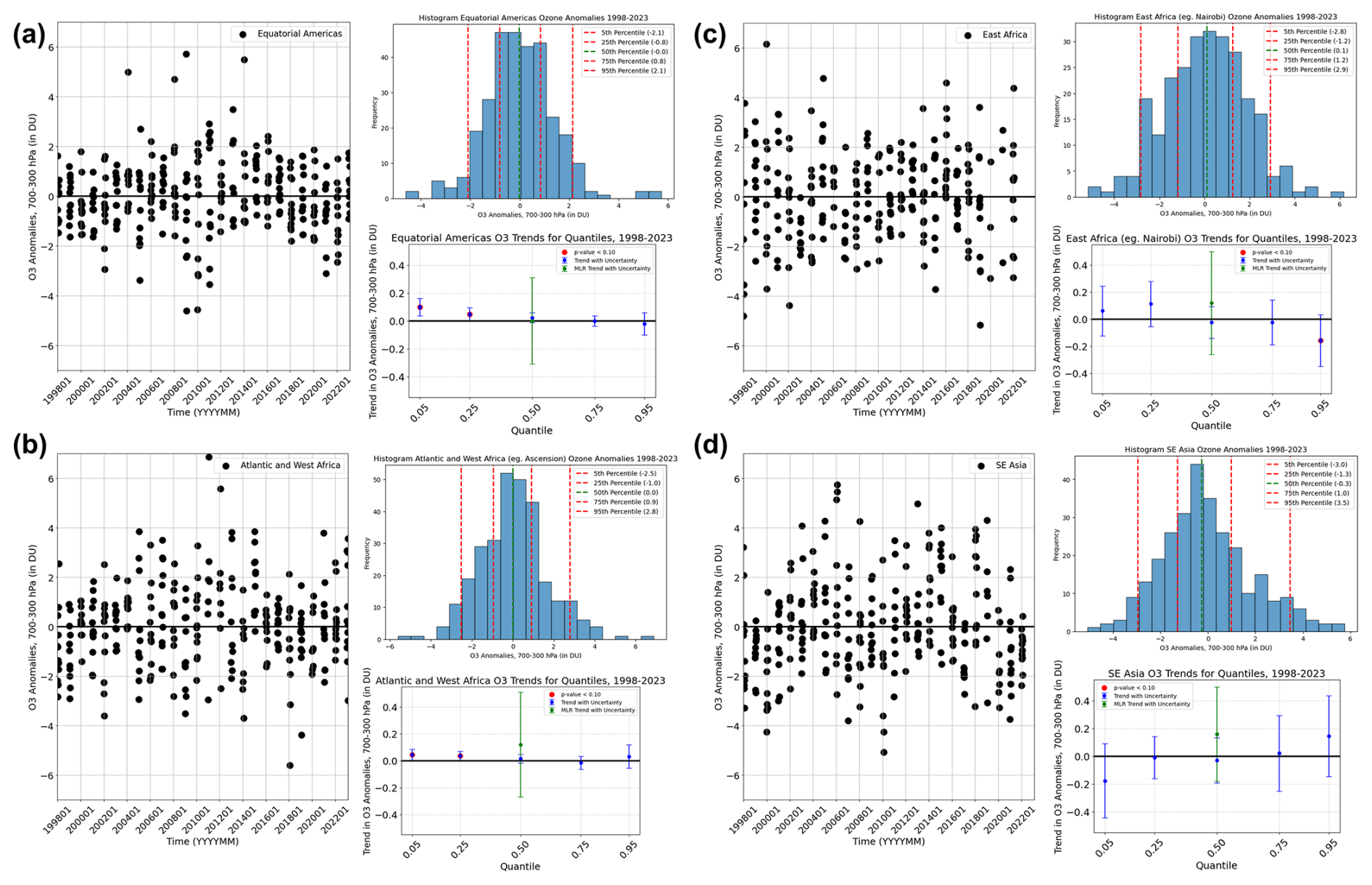 A third way of using SHADOZ profiles in the MLR analysis is in a blend with IAGOS aircraft profile measurements within a lower FT pressure-defined region (“FTp” =300–700 hPa, HEGIFTOM-1). Calculations in the FTp segment are designed to add more samples within the SHADOZ-labeled combination sites (compare profile numbers in Tables 2 and 3) and to augment regional trends in HEGIFTOM-2 where no results are reported for the Equatorial Americas, Atlantic Ocean or most of the African continent. In defining regions for merging SHADOZ and IAGOS observations, we follow locations presented by Tsivlidou et al. (2023). Profiles from the SHADOZ Quito station (2014–2023) and two IAGOS airports (Bogotá and Caracas) are added to the SHADOZ SC-Para profiles to define the Equatorial Americas for determining trends within the FTp (Table 3). Also, for the SHADOZ-IAGOS calculations, sonde profiles from the Natal–Ascension pair are combined with 13 airports in West Africa (Table 3) to determine trends for a region designated “Atlantic+West Africa,” as shown in Fig. 1b (color-coded circles) and the second column of Table 3. In “East Africa” Nairobi sonde data are combined with IAGOS Nairobi and Addis Ababa ozone profiles. The FTp-designated Equatorial SE Asia consists of KL-Java profiles from SHADOZ combined with IAGOS landing and takeoff data from Kuala Lumpur and Singapore. Time series of ozone column amounts (in DU and as anomalies) for SHADOZ stations and airports for these four “regional” sites appear in Fig. 3. The coordinates of individual SHADOZ stations used in the blended dataset (italicized) with IAGOS airports appear in Table 1. Calculations with FTp retain Samoa as a single station.