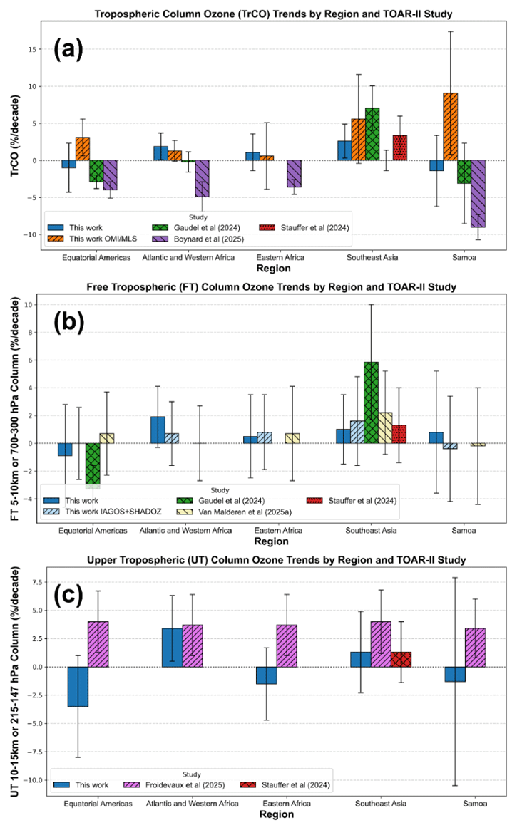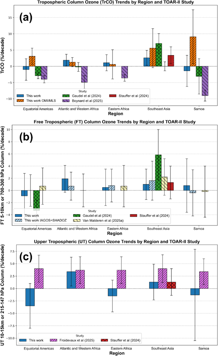 This study and Van Malderen et al. (2025a, b) provide the most reliable TOAR-II trends to date: over the past ∼ 25 years, tropical FT ozone changes have been modest, ∼ (−3–+3) %/decade, except over SE Asia.