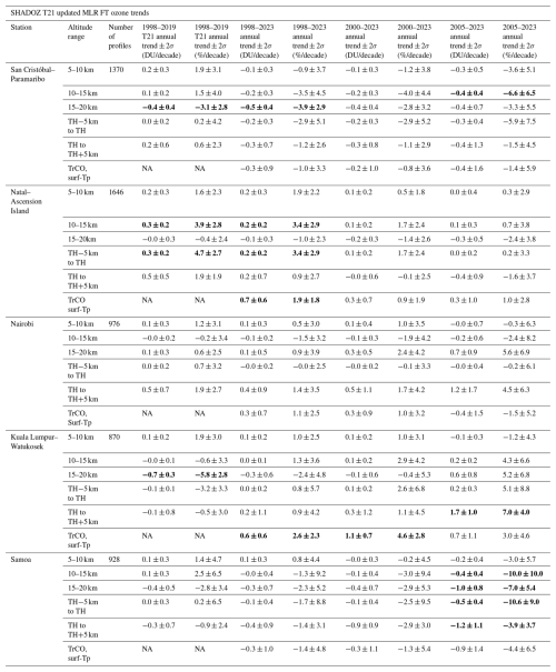 Table 2SHADOZ metadata: number of profiles and annual trends. Each row indicates a different segment: 5–10, 10–15, 15–20 km, TH−5 km to TH, TH to TH+5 km and surface to Tp (tropopause). Periods analyzed (columns) are 1998–2019 (T21), 1998–2023, 2000–2023 and 2005–2023 for OMI/MLR comparisons in total tropospheric ozone column amount (TrCO). Annually averaged MLR partial column ozone linear trends are shown in DU per decade and in percent per decade, with the 95 % confidence interval. Trends with p values <0.05 are shown in bold.