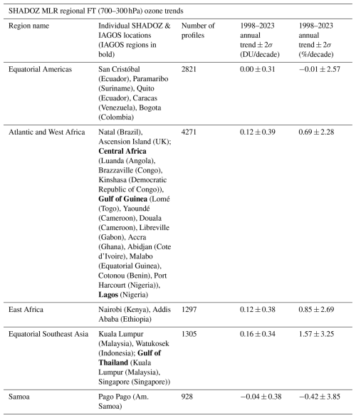 Table 3SHADOZ and IAGOS combined MLR ozone trend values for FTp (700–300 hPa) partial column for five regions: Equatorial Americas, Atlantic and West Africa, East Africa, Equatorial Southeast Asia, and Samoa (individual record). The individual sites are listed for each region. Annually averaged MLR partial column ozone linear trends are shown in DU per decade and in percent per decade, with the 95 % confidence interval. Trends with p values <0.05 are shown in bold.