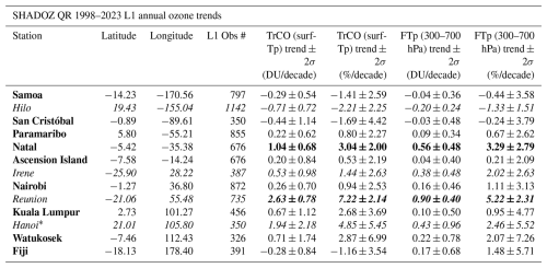 Table 4SHADOZ QR median (50th percentile) annual ozone trend values (1998–2023) for TrCO (surface to tropopause) and FTp (700–300 hPa) columns in DU/decade and in %/decade with ± 2σ. Trends with p values <0.05 are shown in bold. L1 data are daily data from the HEGIFTOM database (https://hegiftom.meteo.be/datasets, last access: 15 July 2025). The italicized stations are the subtropical SHADOZ stations, defined as latitude outside of ± 19°.