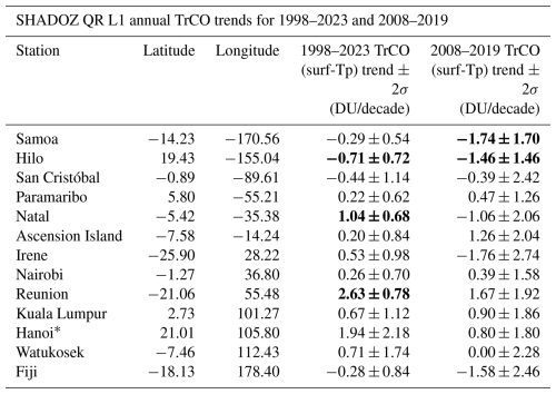Length of trends. These were examined for the individual station TrCOsonde trends by comparing trends for 1998 to 2023 with a 12-year trend (2008–2019), one of two scenarios investigated by Boynard et al. (2025). The uncertainties (as 2σ limits) increase by a factor of 2–3 for TrCO at 10 of 13 SHADOZ stations, and some median trends change sign compared to the 26-year trends (Table 5). The next section shows that even 16-year IASI/Metop trends have an unreasonably low bias with respect to SHADOZ, IAGOS and OMI/MLS trends (Table 6), reinforcing a need for multi-decade datasets where ozone changes are relatively small.