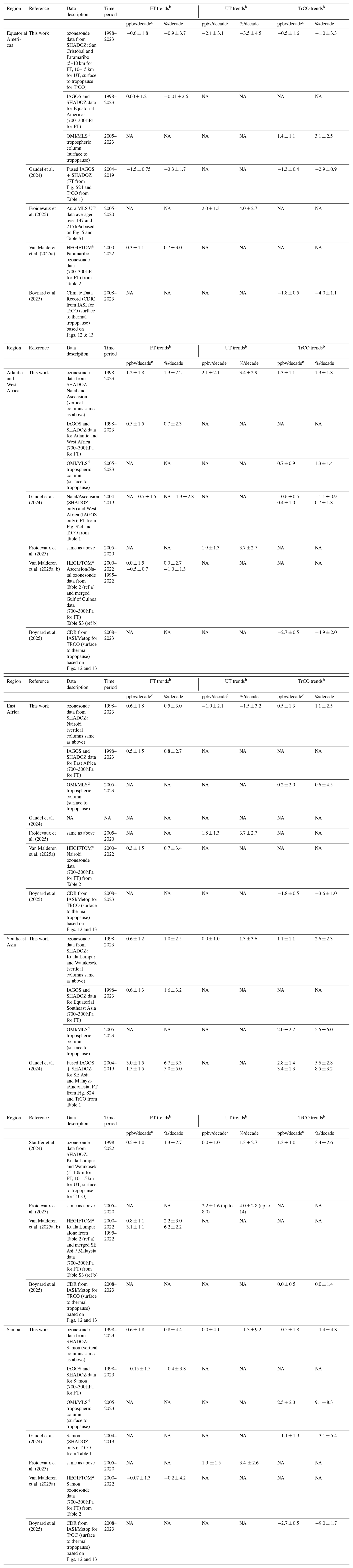 Fourth, by reducing the trend period from 26 to 12 years, we quantified the degradation of trends that are too short for the relatively small changes that apply to much of global FT ozone. The length of trends is only one issue for ozone products derived from satellites that have operated less than 2 decades. Trends based on the lowermost levels of ozone from MLS (Froidevaux et al., 2025) were largely the same at all SHADOZ stations, 3–4 %/decade for the UT (Fig. 16c), whereas the sonde-derived trends are geographically variable. Only one of five tropical regions we analyzed, Atlantic and West Africa, displayed a UT ozone trend in this range. The discrepancies between GB-based and satellite ozone trends are not surprising because MLS does not capture observed variability in UT ozone concentrations, up to a factor of 2 between the Atlantic and western Indian Ocean, that is detected by the sondes or UV sensors (Thompson et al., 2003, 2017). We compared our profile-based trends to two typical satellite products: IASI/Metop and the well-characterized OMI/MLS. Within the uncertainty of the satellite trends, OMI/MLS TrCO trends agreed with TrCOsonde trends in four of five regions. Where sonde-derived trends were near-zero, IASI/Metop trends sometimes agreed well, but for equatorial SE Asia the IASI/Metop zero trend clearly underestimated trends relative to those derived from SHADOZ, SHADOZ-IAGOS combined profiles and OMI/MLS. At Samoa, IASI/Metop (−9 %/decade) and OMI/MLS (+9 %/decade) were both in error, displaying much greater disagreement with the sonde-based trend than anywhere else. There is no easy explanation, but the differing wavelengths, vertical sensitivities and respective biases in the satellite products likely all play a role.