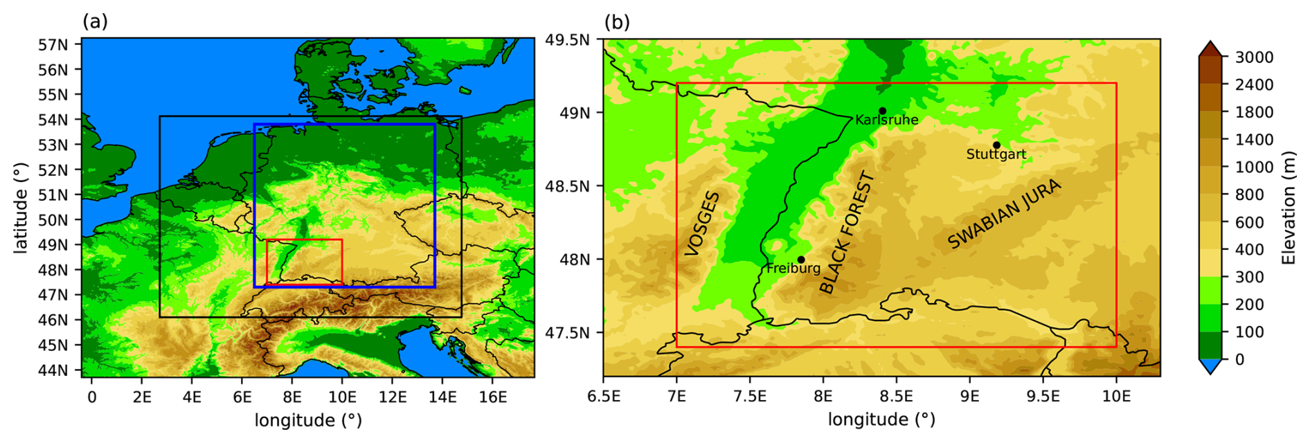 Figure 1(a) Orography of Central Europe (m a.m.s.l.) with the black box indicating the simulation domain with a 1 km grid, the blue box denoting the Germany evaluation domain, and the red box the Swabian MOSES field campaign domain. (b) Orography of the MOSES area, showing a zoomed-in view of the region marked by the red box in (a).