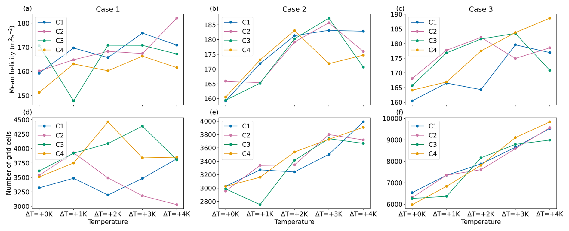 While CCN concentrations do not show a uniform impact on helicity values across all simulations, distinct variations are observed in some cases between different CCN scenarios. In contrast, temperature shows a consistent and stronger influence, with helicity values increasing systematically under warmer conditions. Overall, the impact of temperature on helicity is more pronounced than that of CCN concentration.