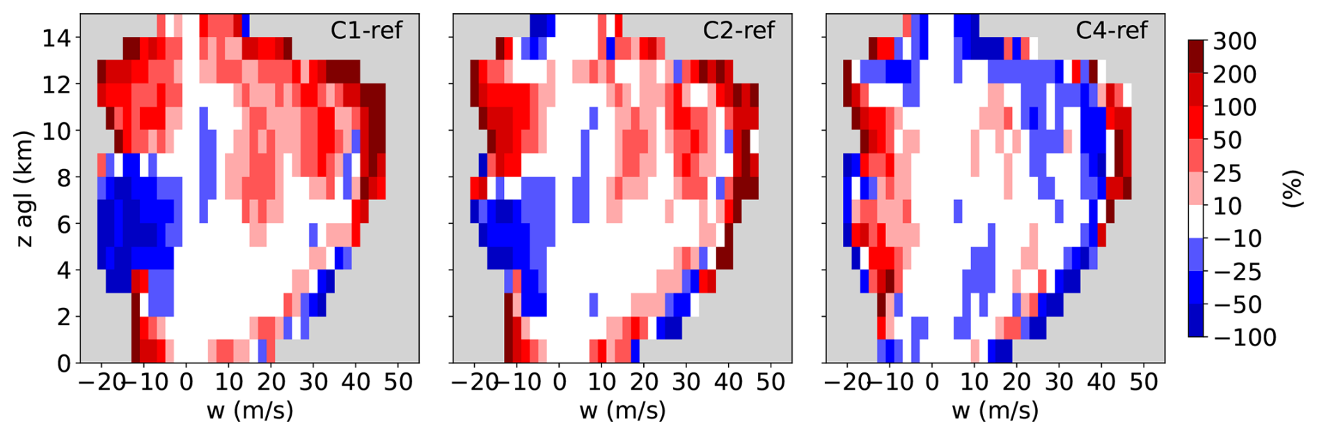 Figure 5Frequency difference of vertical velocity as a function of height and wind magnitude for different CCN concentrations with respect to the reference CCN concentrations (C3) evaluated over the MOSES domain and the full 24 h simulation period. All panels represent the reference temperature without global warming.
