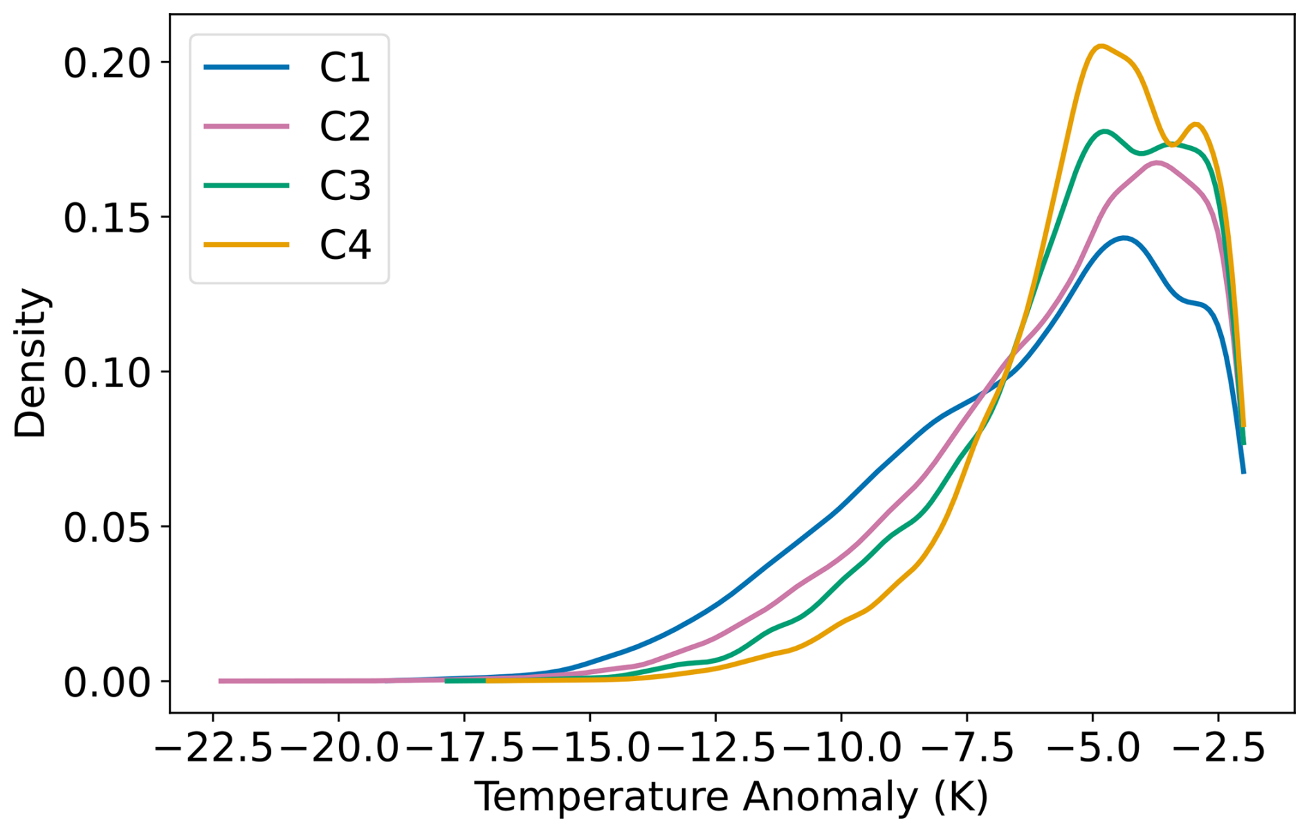 In contrast, changes in CCN concentration influence the frequency and distribution of vertical velocities. For higher CCN concentrations, the occurrence of strong updraughts (20–30 m s−1) in the upper troposphere decreases (Fig. 5). While downdraught intensity also weakens in the upper troposphere, a slight increase is observed in the middle to upper troposphere. Near the surface, downdraught strength again diminishes. This vertical structure could be linked to enhanced precipitation loading aloft in a low CCN environment, which contributes to stronger downdraughts at mid-levels but less pronounced impacts near the surface. To further investigate the impact of CCN concentration on convective dynamics, cold pools are analysed as an additional measure of storm intensity. Cold pools, which form through evaporative cooling in precipitating downdraughts, influence storm organisation and surface outflows. The methods used to identify and quantify cold pools in this study are described in Sect. 2.4.1. Figure 6 illustrates how varying CCN concentrations affect the strength and distribution of cold pool anomalies. The highest CCN case (C4) exhibits a pronounced peak around −5 K with a narrow distribution and a short tail, indicating frequent but moderate cold pool anomalies. As CCN concentrations decrease, the distributions broaden and develop longer tails, indicating greater variability and a higher occurrence of stronger cold anomalies. This enhanced cold pool intensity at lower CCN concentrations is also reflected in the downdraughts: increased downdraught strength is observed in the lower troposphere under low CCN conditions (not shown). This behaviour is consistent with the known mechanism in which enhanced subcloud evaporative cooling leads to stronger cold pool formation and, consequently, more intense downdraughts. The increased evaporation under low CCN conditions is further promoted by the formation of larger raindrops, which evaporate more efficiently as they fall through the subcloud layer, enhancing cooling.