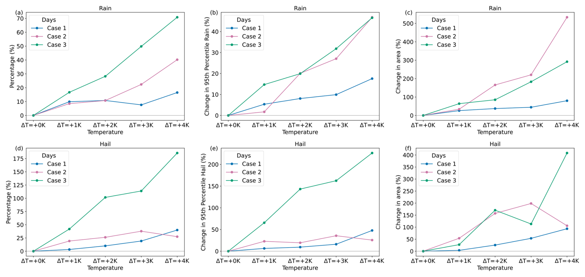 Recent modelling studies have explored how convective storms respond to rising temperatures using the pseudo-global warming (PGW) approach, which isolates thermodynamic effects by modifying initial and boundary conditions in high-resolution simulations. In this framework, large-scale circulation patterns are preserved, but the temperature profile in the initial and boundary conditions is uniformly increased, and humidity is adjusted according to the Clausius–Clapeyron relationship under constant relative humidity. This ensures that only thermodynamic effects are perturbed, while synoptic-scale dynamics remain unchanged. These studies confirm that warming can intensify deep convection and hail production, though the magnitude and spatial characteristics of these changes vary with model configuration and regional context (Feng et al., 2024; Lin et al., 2024; Tahara et al., 2025). For example, using a PGW-approach with 3 K warming, Thurnherr et al. (2025) found an increase in summer hail frequency in northeastern Europe and a decrease to the southwest for intense and severe hail days, related to changes in low-tropospheric water vapor content, convective available potential energy (CAPE) and convective inhibition (CIN). As a result, considerable uncertainty remains regarding how convective hazards such as hailstorms or supercells will evolve in a future climate.