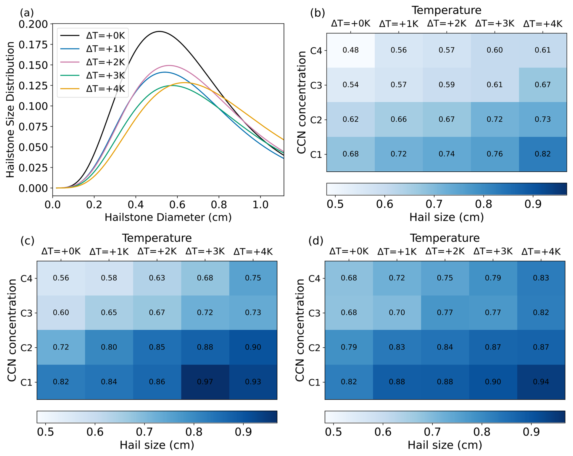 To evaluate the impact of temperature and CCN concentration on the largest hail sizes, the hail size distribution is extended beyond the model’s initial output up to the point where the distribution curve returns to a relative frequency of 0.0025. In the model, the particle mass x is constrained by a maximum value xmax, which limits the simulated hail size distribution (Fig. 8a) and excludes hailstones larger than 2.3 cm. However, when comparing the extended size distribution curve for larger x with the model’s output, both follow the same trend, indicating that the distribution can be reliably extended to account for larger hailstones. Therefore, the hail sizes corresponding to a distribution value of 0.0025 are determined from the extended hail size distribution curve and analysed using the same approach as for the dominant hailstone sizes. The results reveal an almost identical pattern for the changes in dominant and maximum hailstone sizes (not shown), confirming that not only do medium-sized hailstones grow larger in a warmer climate, but the large hailstones also experience strong growth. These findings are particularly concerning given the high damage potential associated with large hailstones.