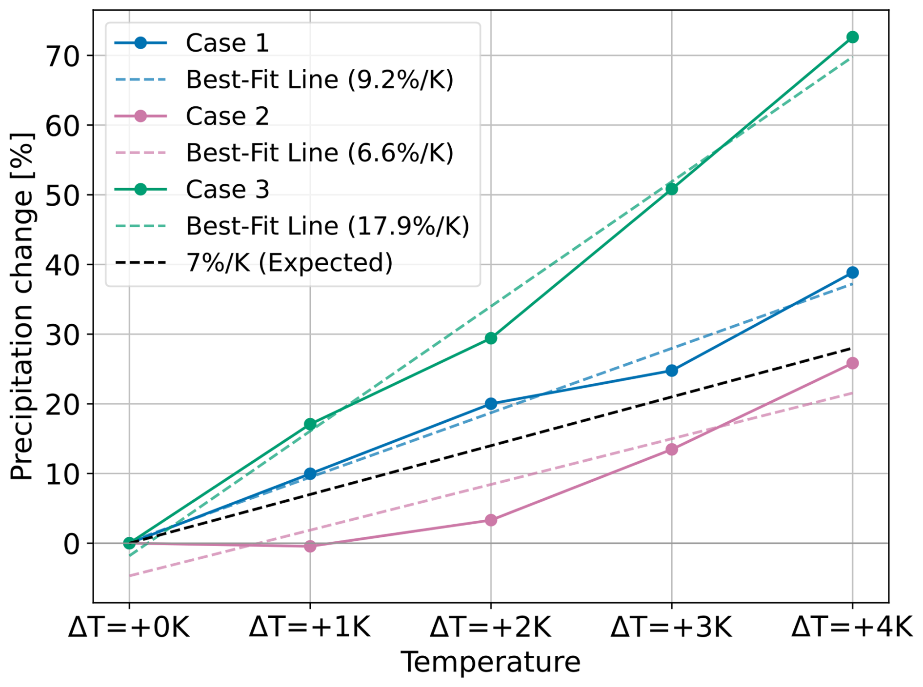 To explain the observed increase in precipitation, Clausius–Clapeyron (CC) scaling provides an essential theoretical framework. Although uncertainties persist, it is widely accepted that rising temperatures intensify heavy precipitation events by increasing the atmosphere's water vapour-holding capacity (Hardwick Jones et al., 2010). According to the CC relationship, water vapour content, and consequently precipitation, increases by approximately 6 % K−1–7 % K−1 (Risser and Wehner, 2017). This study investigates to what extent precipitation changes in convective storm events follow the expected CC scaling, and whether deviations from this rate, known as super-CC responses, can be identified under warming conditions. In our simulations, water vapour content is adjusted according to CC scaling, ensuring an initial increase close to the predicted 7 % K−1 (not shown). However, accumulated precipitation does not consistently follow this trend, as shown in Fig. 9. In particular, case 1 and case 3 exhibit distinctly greater increases in precipitation, far exceeding 7 % K−1. For case 3, precipitation increases by more than 17 % K−1, while for case 1, an increase of over 9 % K−1 is simulated. These extreme increases persist even when only looking at rainfall and not total precipitation, suggesting the presence of super-CC scaling effects. In contrast, in case 2, precipitation follows the expected CC scaling, increasing by 6.5 % K−1. One possible explanation for the strong deviation in case 3 is the presence of moderate to strong large-scale synoptic ascent supporting convection initiation (see Fig. 2e). In line with previous findings, such as those by Fowler et al. (2021), stronger synoptic-scale ascent and enhanced moisture convergence under warmer conditions may amplify convection and contribute to super-CC responses. This indicates that while CC scaling explains part of the observed precipitation increase, additional dynamical and microphysical processes must also contribute to the deviations beyond the thermodynamic expectation for cases 1 and 3, necessitating further investigation to identify the mechanisms driving these super-CC precipitation trends. The non-linear character of microphysical processes and the chaotic nature of atmospheric convection, in which small differences in environmental conditions can lead to large impacts on simulated storms, are likely key factors behind the super-CC scaling. Convection triggering is also highly dependent on environmental conditions; small differences in temperature or humidity can determine whether or not deep convection is initiated at a given time and location. For example, different CCN concentrations can determine whether or not a supercell is successfully simulated (Barthlott et al., 2024). The strong invigoration of convection with temperature has been discussed to amplify the scaling rate with temperature or shifts from low-intensity stratiform rainfall to higher-intensity convective rainfall (Da Silva and Haerter, 2025). It should be noted that the short predictability timescale of convective processes, particularly during initiation, can lead to non-linear responses. This inherent sensitivity may contribute to some of the amplified or variable trends observed in the simulations.