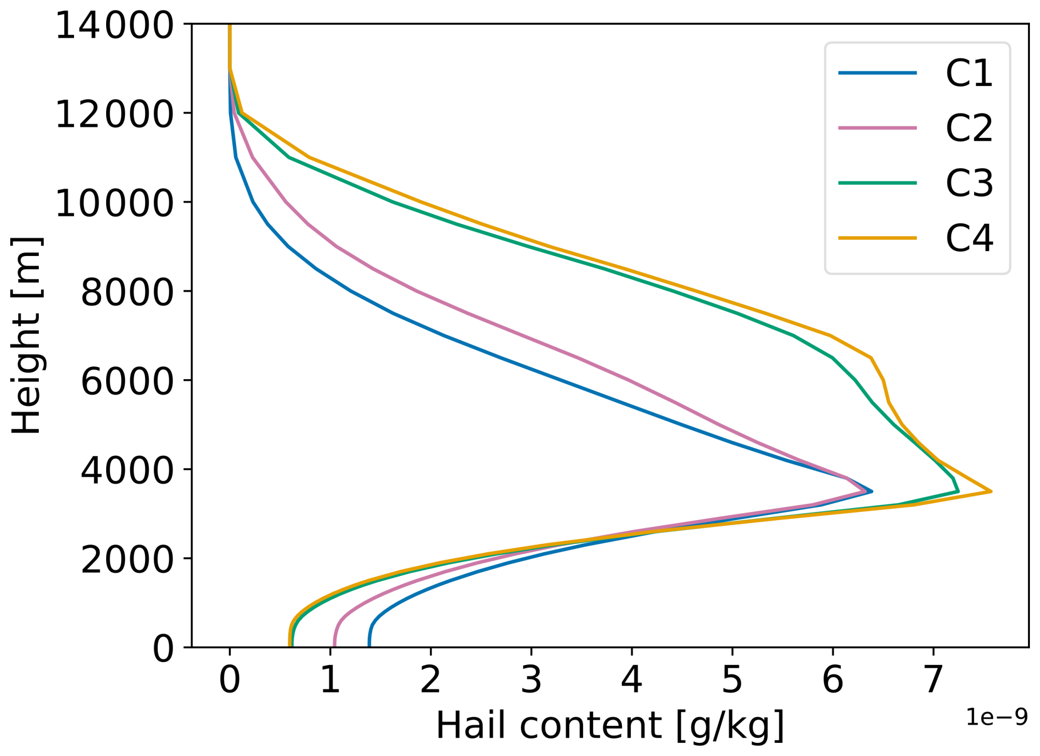Rain freezing, deposition, and riming are all processes contributing to graupel and hail formation (Fig. 11k, q, o). The only hail production component that strongly decreases with higher CCN concentrations, mirroring the trend in surface hail content, is total riming, which exhibits an average change between 20 % and 40 %. However, riming is the most important contributor to hail and graupel formation, with a magnitude approximately four times greater than rain freezing and deposition. Consequently, rain freezing and deposition have a negligible impact on hail formation. Interestingly, while column-integrated graupel content decreases in a high CCN environment within the column (Fig. 11n), hail content increases (Fig. 11p), which is the opposite of what occurs at the surface. Typically, a decrease in the total column would not be expected to correspond with an increase at the surface. To understand this behaviour, it is essential to consider the differences in hailstone sizes at varying CCN concentrations. This study previously found that hailstones grow larger in low CCN environments. Conversely, in low CCN environments, where hailstones are larger, melting is expected to be less efficient due to their lower surface-to-mass ratio. This interpretation is consistent with the vertical profiles of hail content (Fig. 12), which suggest reduced melting in low CCN cases (the lowest maximum around 4 km agl of all different CCN concentrations, but the largest values at the ground). It should be noted that the model output provides combined melting rates of hail and graupel, so hail-only melting cannot be quantified separately. Nevertheless, the earlier analysis of hail size distributions at the surface (Fig. 8) clearly shows that larger hailstones reach the ground under low CCN concentrations, and the reduced efficiency of melting provides a plausible mechanism for this behaviour. A comparable mechanism operates in warmer environments: stronger updraughts favour the growth of larger hailstones, which are less sensitive to melting due to their lower surface-to-mass ratio, while smaller stones are more prone to melting during descent. This dual effect explains why both warming and CCN reductions contribute to a coherent shift in the hail size distribution towards larger hailstones at the surface. Simultaneously, more graupel transforms into hail, while the remaining graupel melts before reaching the surface, leading to a decrease in surface graupel content under lower CCN conditions. This mechanism could also explain the overall relatively constant melting rates (Fig. 11m). However, since the output of the model does not differentiate between the melting rates of graupel and hail, direct verification of this hypothesis remains challenging.