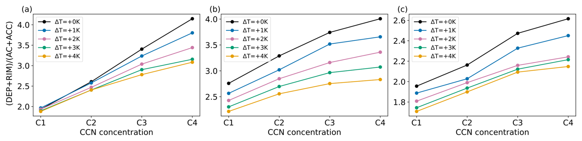 DEP represents deposition, RIM denotes riming, and AC and ACC are autoconversion and accretion (Barthlott et al., 2022a). Figure 13 presents the results for each simulation day, showing variations in temperature and CCN concentrations. Across all days, higher CCN concentrations are associated with an increased cold-to-warm rain formation ratio, indicating a stronger contribution of cold rain processes. From a physical perspective, high concentrations of aerosols slow down the onset of warm rain by inhibiting autoconversion and lowering the effectiveness of collision–coalescence. Consequently, a larger amount of cloud water can ascend into the mixed-phase region, where it contributes to cold-rain formation. Consequently, a shift to the cold pathway exists. In the scenarios with higher temperatures, the cold-to-warm ratio is systematically reduced across all CCN regimes. The higher the temperature increment, the lower the resulting cold-to-warm ratio. As expected with higher freezing levels in warmer environments, the vertical range for the warm-phase pathway increases, whereas the one for the cold-rain pathway decreases. As a result, the percentage increase with larger aerosol loads is smaller for higher temperatures.