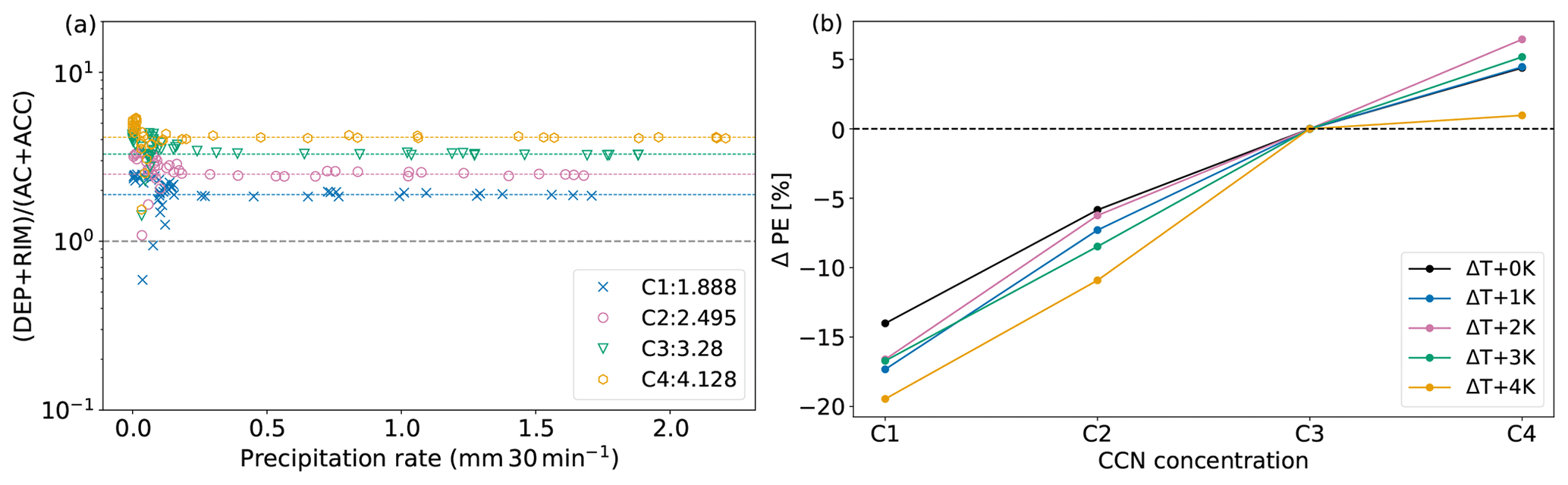 Figure 14(a) Cold-to-warm rain ratios (DEP + RIM)(AC + ACC) plotted for each half an hour for different CCN concentrations (case 1): C1 (blue cross), C2 (orange circle), C3 (green triangle), C4 (red hexagon). Dashed lines in the corresponding colour represent the mean taken for all data points having precipitation rates larger than 0.2 mm 30 min−1. The legend includes the mean cold-to-warm rain ratios of each CCN concentration shown by the dashed lines. (b) Precipitation efficiency of all four CCN concentrations for all simulation temperatures for case 1. The MOSES domain was used, which is defined in Fig. 1.