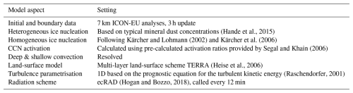(Hande et al., 2015)Kärcher and Lohmann (2002)Kärcher et al. (2006)Segal and Khain (2006)(Heise et al., 2006)(Raschendorfer, 2001)(Hogan and Bozzo, 2018)2.2 Simulations overview